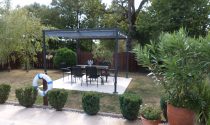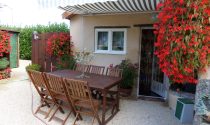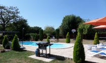 Chateau Grounds – fabulous landscaped gardens with tiny hedges and flowers leading to a Heated In-ground swimming pool (8.5m x 3.5m with a depth of 0.9m – 1.7m), there is a safety ledge around the whole pool, even in the deeper part. There are lawned areas either side of the pathway leading to the pool. A much larger area of lawn for games, etc. Surrounds the pool. There are several Wood Several Cabins, closed and open for storage and eating A-Fresco (in the shade) as well as a lovely pergola with views pf the pool for eating in the sunshine. There is also an eating area outside the kitchen door – make the coffee and then sit in the garden on those lovely sunny mornings.