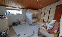 The open-plan kitchen, renovated in 2021, flows into a bright dining room. The large living room with a fireplace is perfect for relaxing, while the outdoor veranda offers garden views. The ground floor includes air conditioning and a spacious entrance hall/pantry.