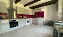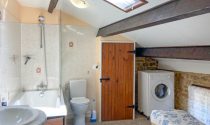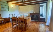 Ground floor: Entrance into a 27m2 living room with wooden floor, stone fireplace with wood burner, feature walls of exposed stone, beamed ceiling, traditional bull’s eye oval window and a door opens to the front garden. Dining room of 19m2 which has an electric fire, beamed ceiling and the same wooden floor as the lounge. Following on is the lovely bight + airy 15m2 kitchen, fully fitted and equipped, it has a tiled floor, beams, window seat and a door opens to the covered terrace. A hallway leads to the cellar and the first floor.