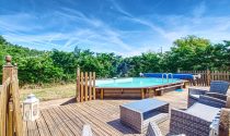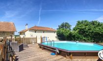 In the back garden is an above-ground pool with raised wooden decking.