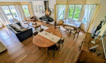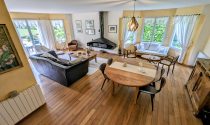 - Living/Dining room (47m²) with unique signed fireplace, sofa, southwest exposure, 2 BOW WINDOWS for maximum brightness, and access to a 50m² terrace