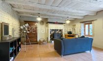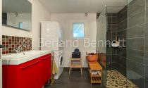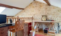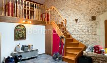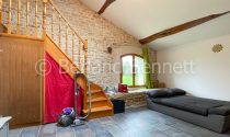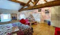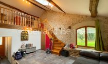 Ground floor: Entrance Hall, large 36m2 fitted + equipped kitchen with a tiled floor, beamed ceiling, central island with a sink and a wood burning fire. 35m2 living room with a tiled floor, beamed ceiling, exposed stone and a wood burning fire. To the rear is a 35m2 lounge/games room with a wooden staircase, a gorgeous 21m2 bedroom with full height ceiling, exposed stone and a wooden staircase up to the mezzanine used as a study/office. A stylish shower room has a large shower, WC, large sink unit and plumbing for a washing machine.
