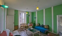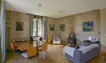 On the first floor is a lovely, bright room — currently an art studio, a TV lounge, a music room, and a bedroom with a mezzanine above.