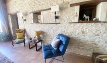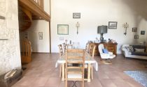 -Entrance / living / dining room (104m²): tiled floor with underfloor heating, fireplace, 2 velux windows, exposed stonework