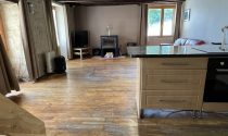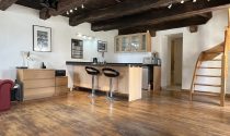 -Living room (36m²) : parquet flooring, stove, beams, exposed stone, fitted kitchen, projector and screen
