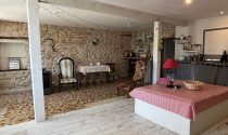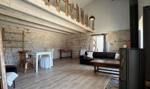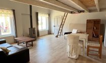 Cozy living room (33 m²) – laminate flooring, exposed stone walls, wood-burning stove, and a 16 m² mezzanine that can be used as a guest bedroom