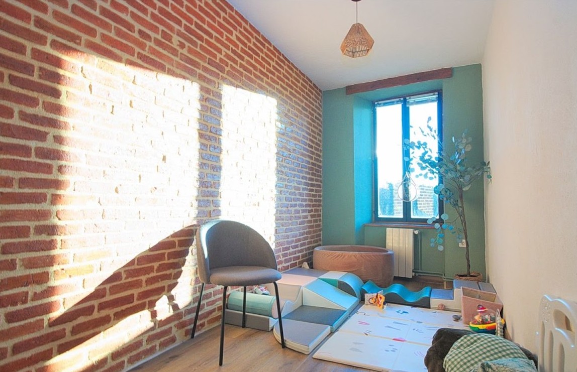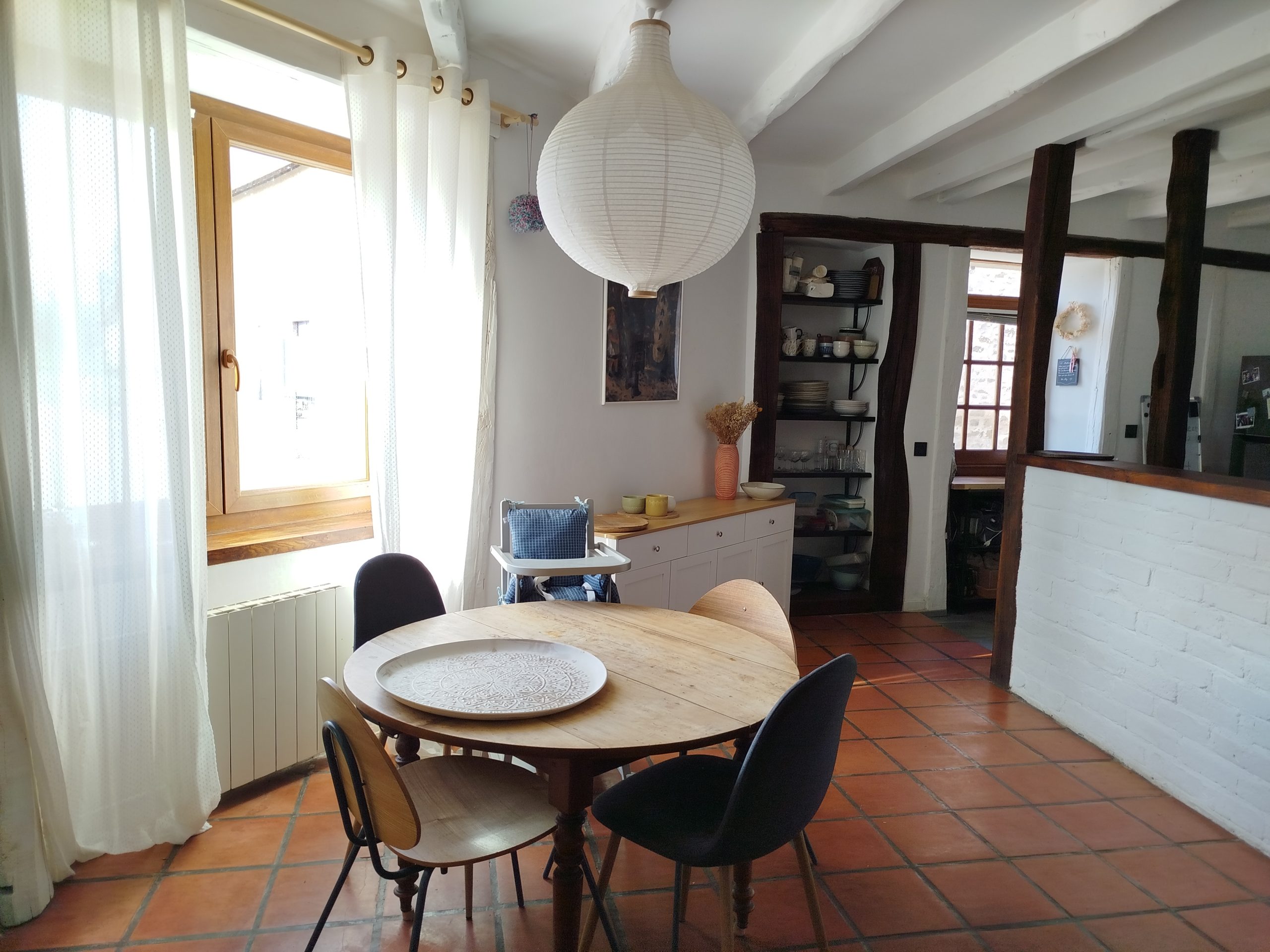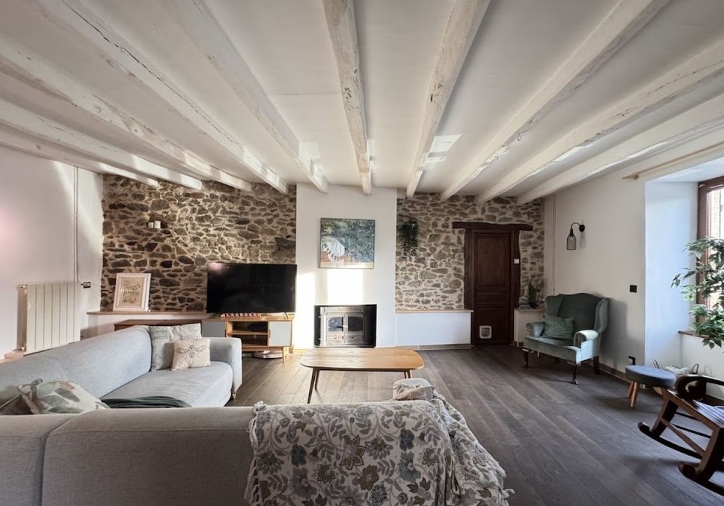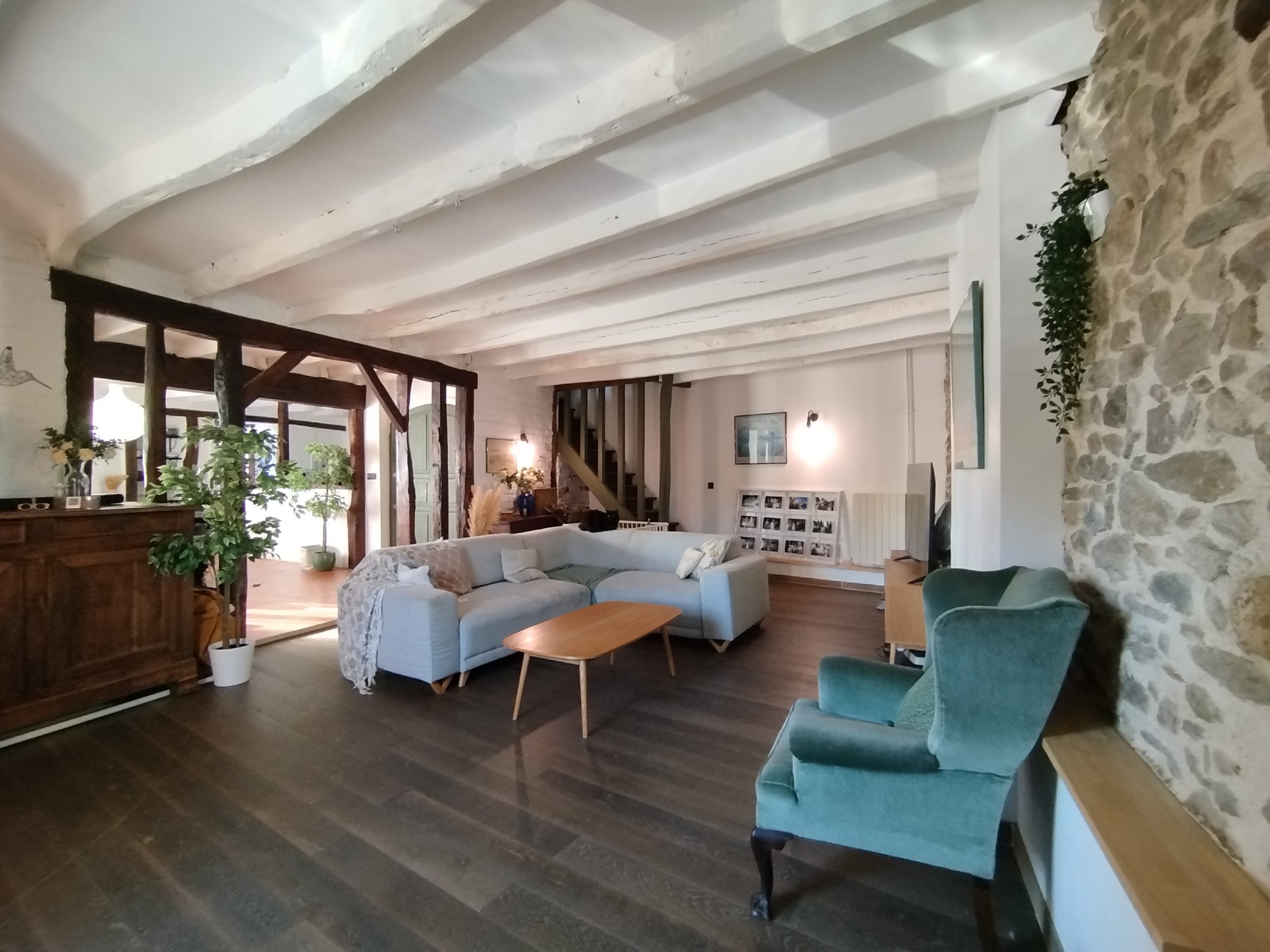 This detached house offers 5 bedrooms, 2 bathrooms, and 3 separate toilets (one on each floor). It features beautiful exposed stone and red brick walls, as well as exposed wooden beams, adding warmth and charm to every room.