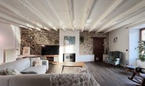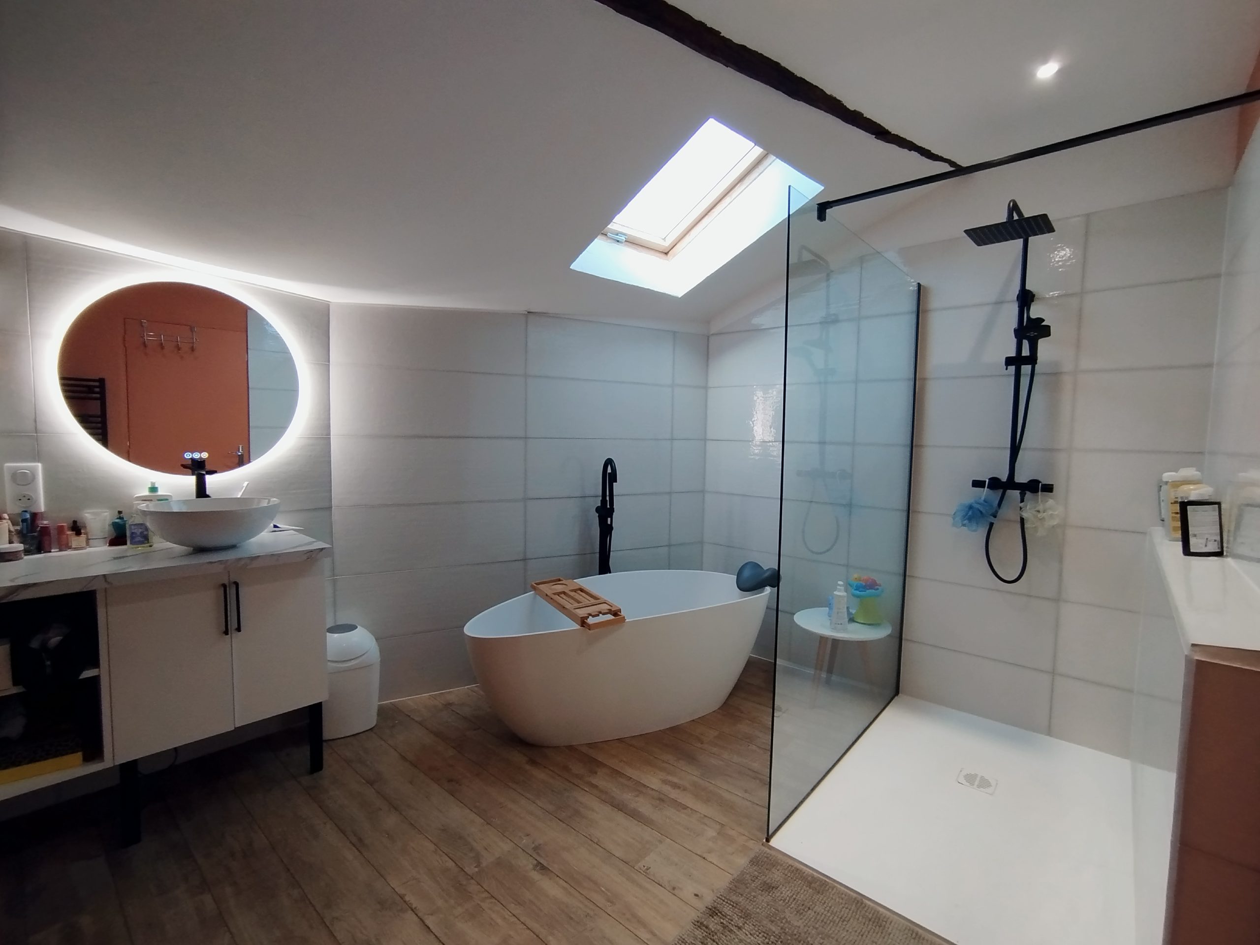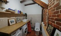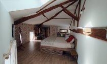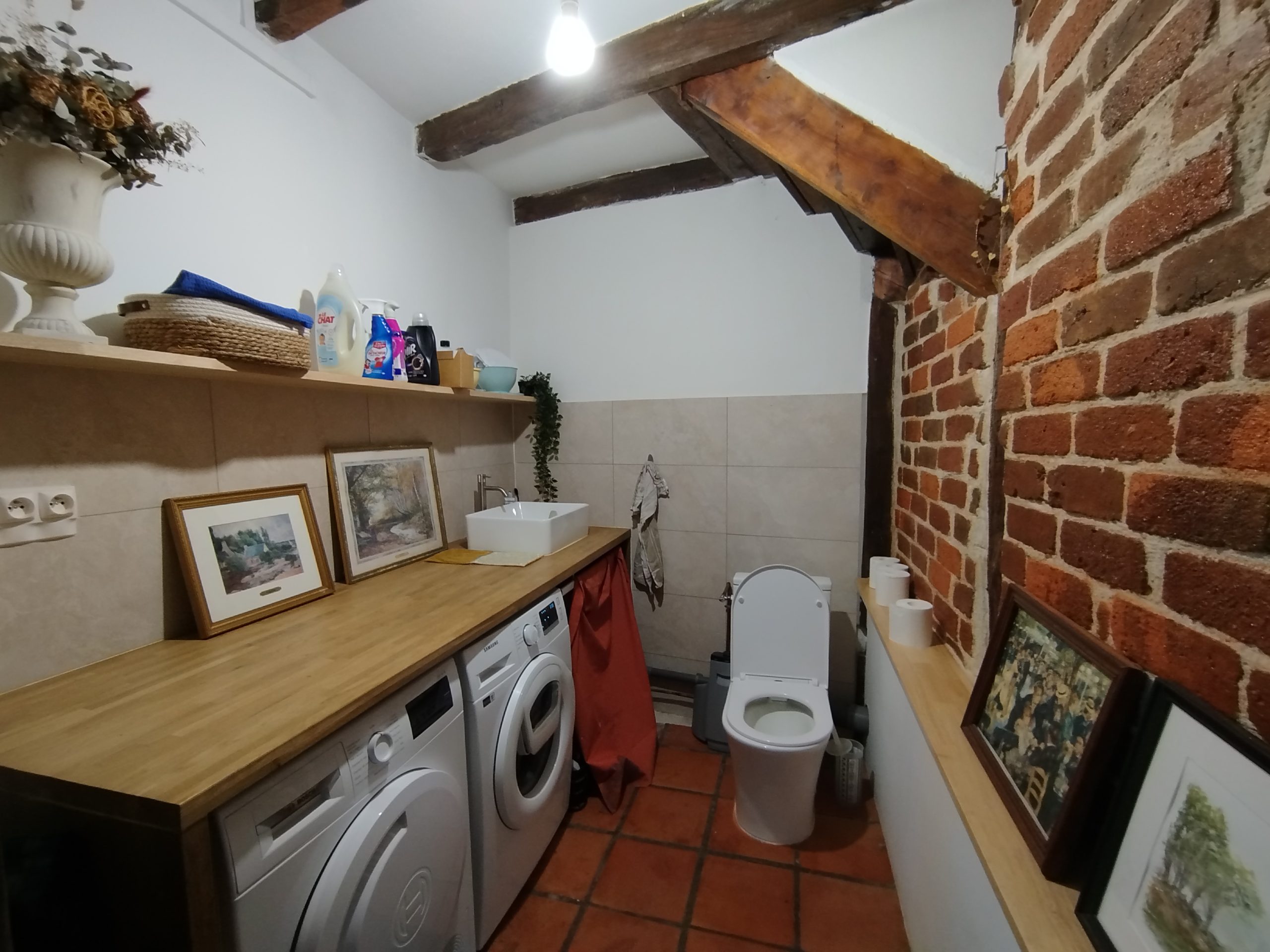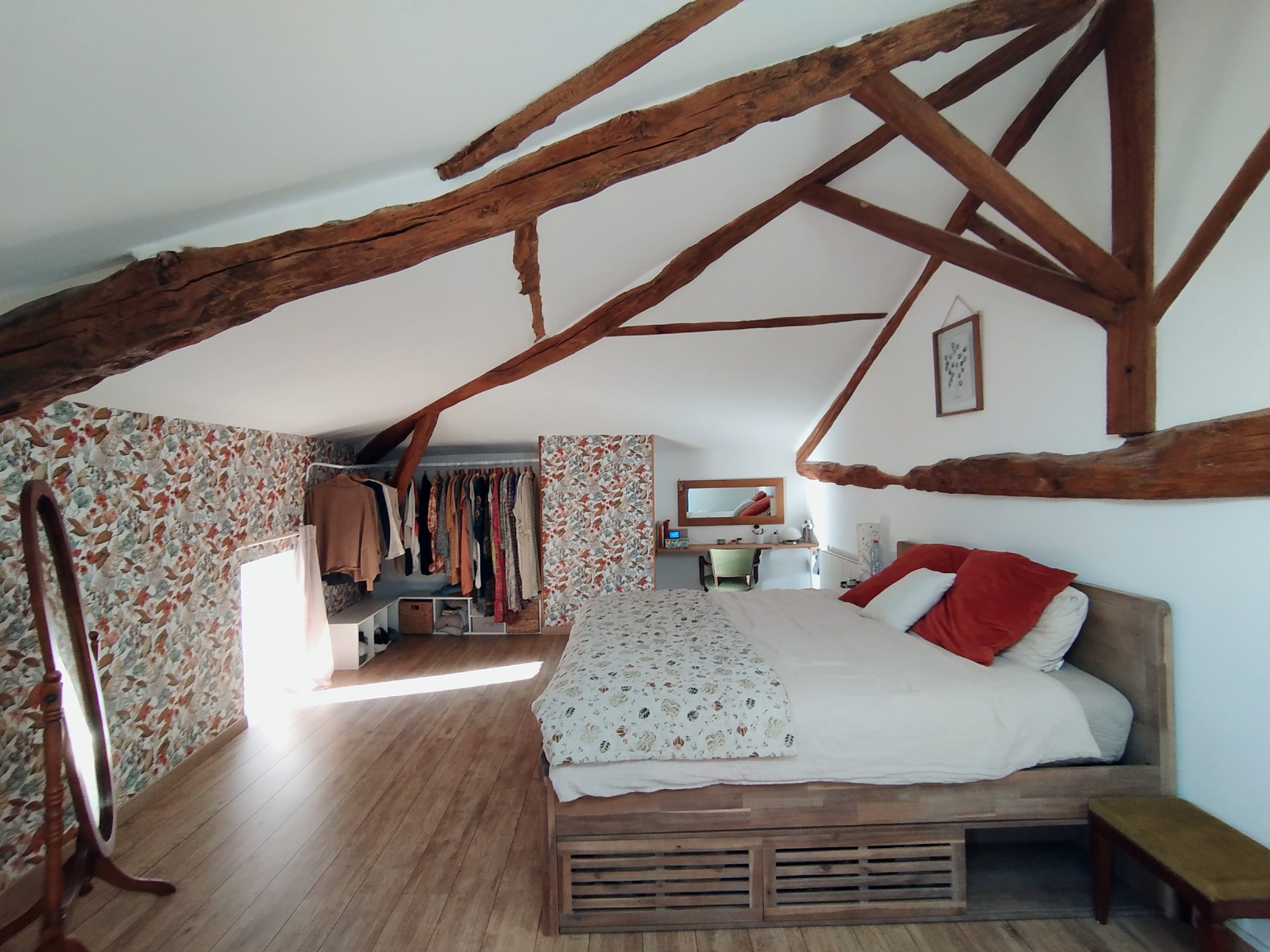 This detached house offers 5 bedrooms, 2 bathrooms, and 3 separate toilets (one on each floor). It features beautiful exposed stone and red brick walls, as well as exposed wooden beams, adding warmth and charm to every room.