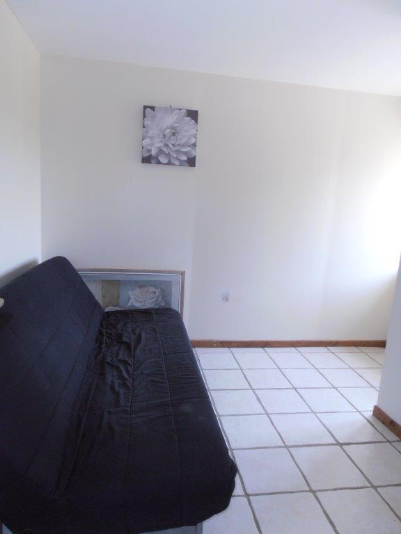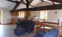 Open-plan living area with a fitted corner kitchen (50m²). This lovely light room has windows with views over the surrounding countryside and the garden. It has a tiled floor, beams and exposed stone, and an insert wood burner. French windows lead onto a balcony/decking with steps down to the garden.