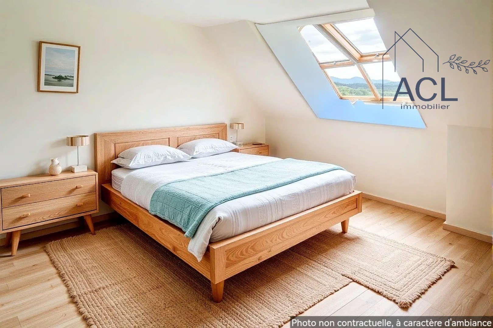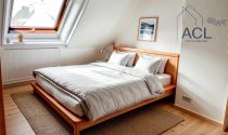 Upstairs, the sleeping area is accessed by a travertine staircase with a wrought iron railing, leading to a landing that serves two bedrooms: one with a built-in closet, the other with a walk-in wardrobe. Through the roof windows, the view opens onto the nearby little port, like a living postcard. An additional, unfinished space offers the possibility to create an extra bathroom.