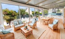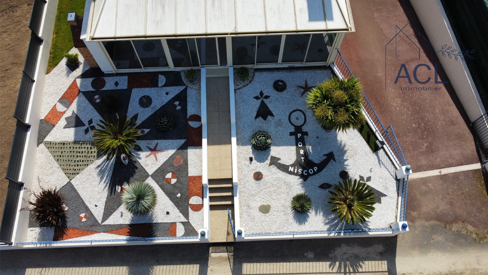 The entrance to the house is through a spacious, light-filled veranda that opens onto a carefully landscaped garden. With white, grey, and black gravel, succulents, and exotic shrubs, the atmosphere is both mineral and warm, inviting contemplation.