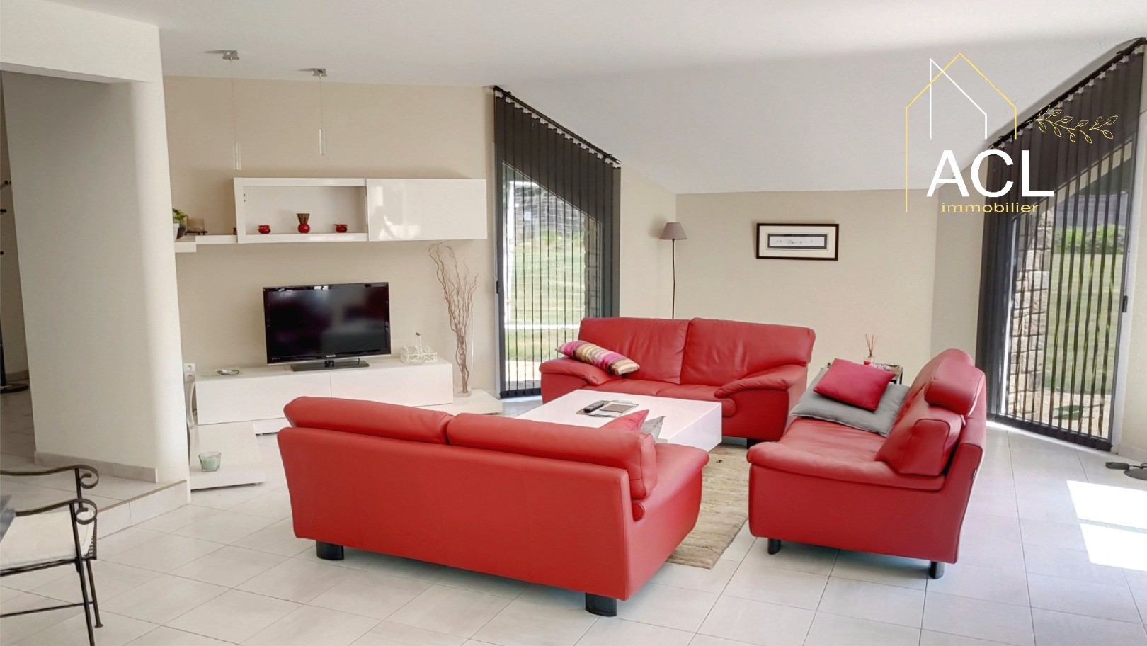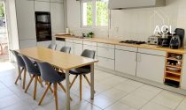 The kitchen, the beating heart of the house, is both functional and welcoming. Fully fitted, it combines timeless elegance with modern comfort. It features wooden worktops and plenty of storage. Open to the outside, it provides direct access to the terrace with a view of the pool. A counter subtly marks the transition to the dining room. In the reception rooms, white walls enhance the sense of space and brightness. The white tiled floor adds a contemporary touch to the whole. The layout is fluid, the volumes harmonious. The living room, bathed in light thanks to large windows overlooking the park, offers a soothing atmosphere. It invites you to relax, read, or simply enjoy conversations. A black wood-burning stove adds a warm touch to winter evenings, complemented by underfloor heating. The dining room naturally extends outside through sliding glass doors that open onto the terraces, ensuring perfect continuity between indoors and outdoors.