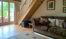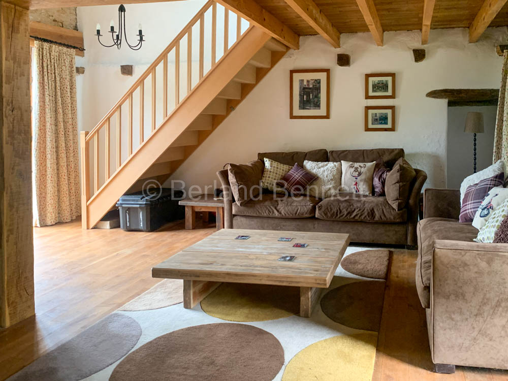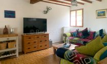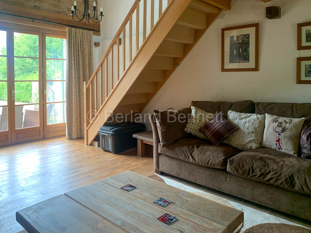 Ground floor: Spacious living room of 32m2 with a wood burning fire, oak wood floor, part full height beamed ceiling, a bespoke wooden staircase leads up to a mezzanine above, double aspect windows, door to the front and French doors that flood the room with natural light and open to the rear garden. Large L shaped kitchen/dinner of 25m2, at one end a full fitted/equipped modern kitchen, the middle has space for a large dining table and a snug lounge area, the floor is tiled, the ceiling beamed, and 2 sets of French doors open to the adjoining covered terrace. Shower room with WC, a hallway has a wooden staircase and a storage cupboard and there is a bedroom of 9.5m2