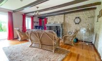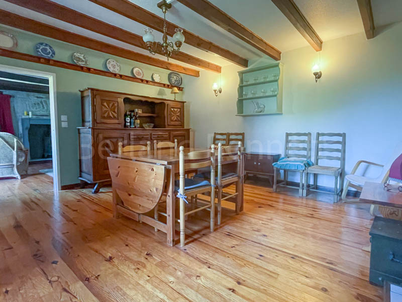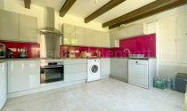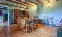 Ground floor: Entrance into a 27m2 living room with wooden floor, stone fireplace with wood burner, feature walls of exposed stone, beamed ceiling, traditional bull’s eye oval window and a door opens to the front garden. Dining room of 19m2 which has an electric fire, beamed ceiling and the same wooden floor as the lounge. Following on is the lovely bight + airy 15m2 kitchen, fully fitted and equipped, it has a tiled floor, beams, window seat and a door opens to the covered terrace. A hallway leads to the cellar and the first floor.
