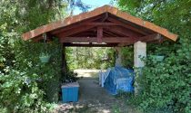 A detached hangar provides ample storage for garden tools and equipment, and could easily be transformed into a workshop or hobby space.