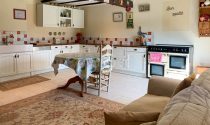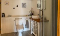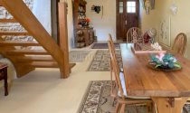 On the ground floor, a spacious 26 m² entrance hall with polished concrete flooring highlights a graceful wooden staircase. The 28.5 m² living room, complete with a fitted kitchen, an elegant stone fireplace, and a wood-burning stove, opens directly onto the enclosed garden—perfect for seamless indoor-outdoor living. Two delightful bedrooms of 20.5 m² and 15 m², one with a private shower room and WC, along with a practical utility room and an additional WC.