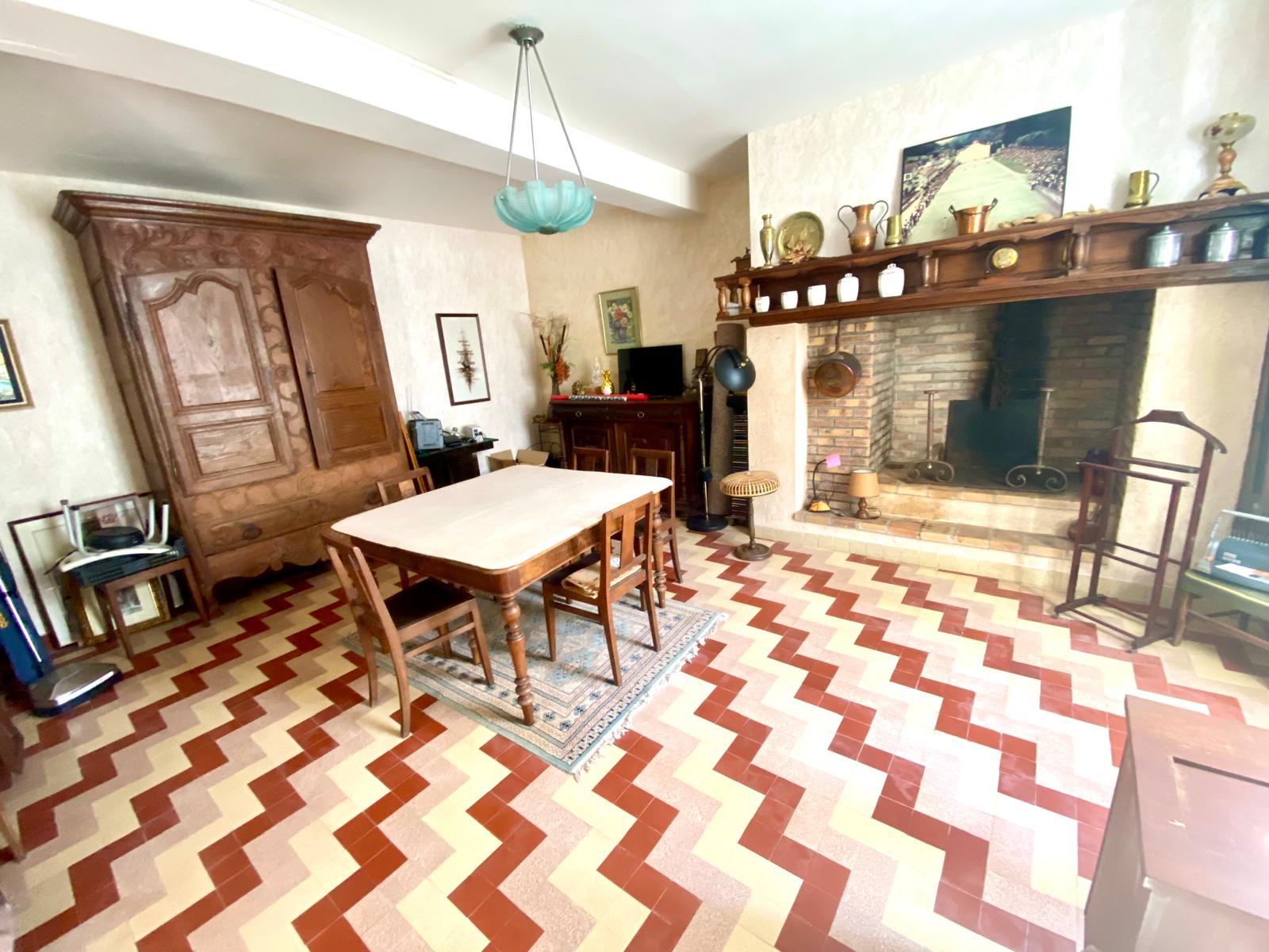 A spacious living/dining room with a majestic period fireplace