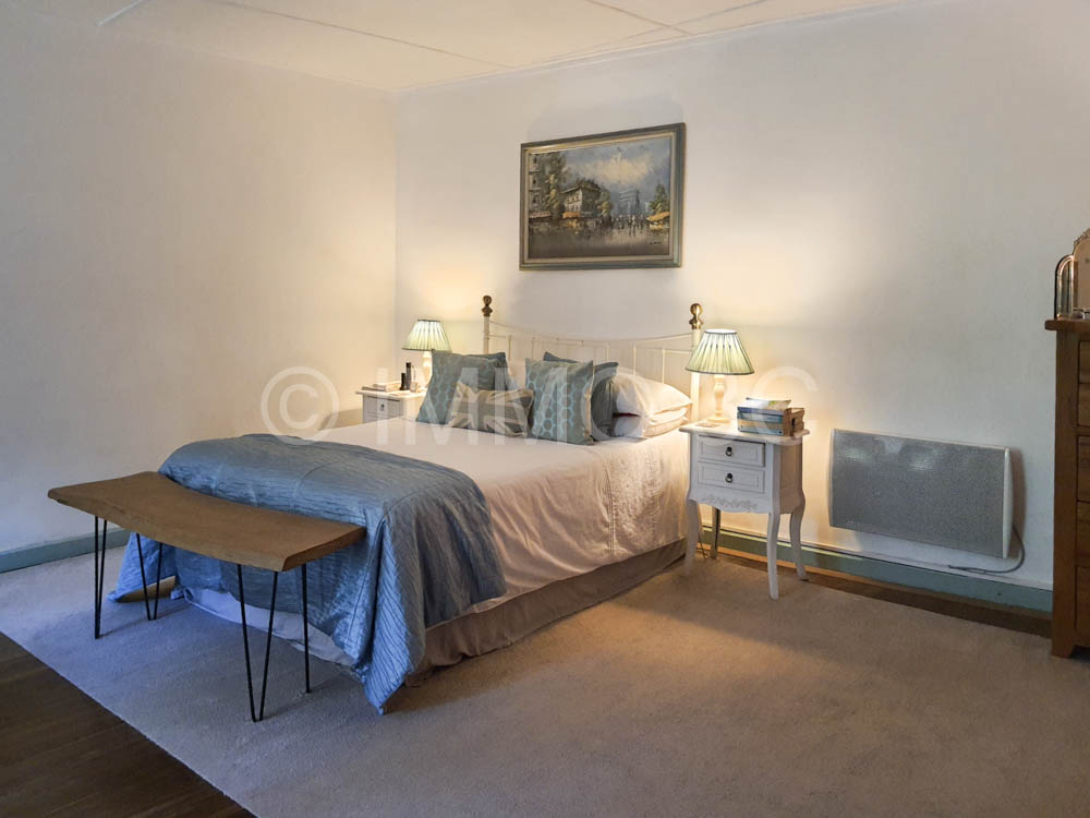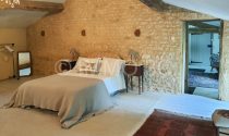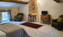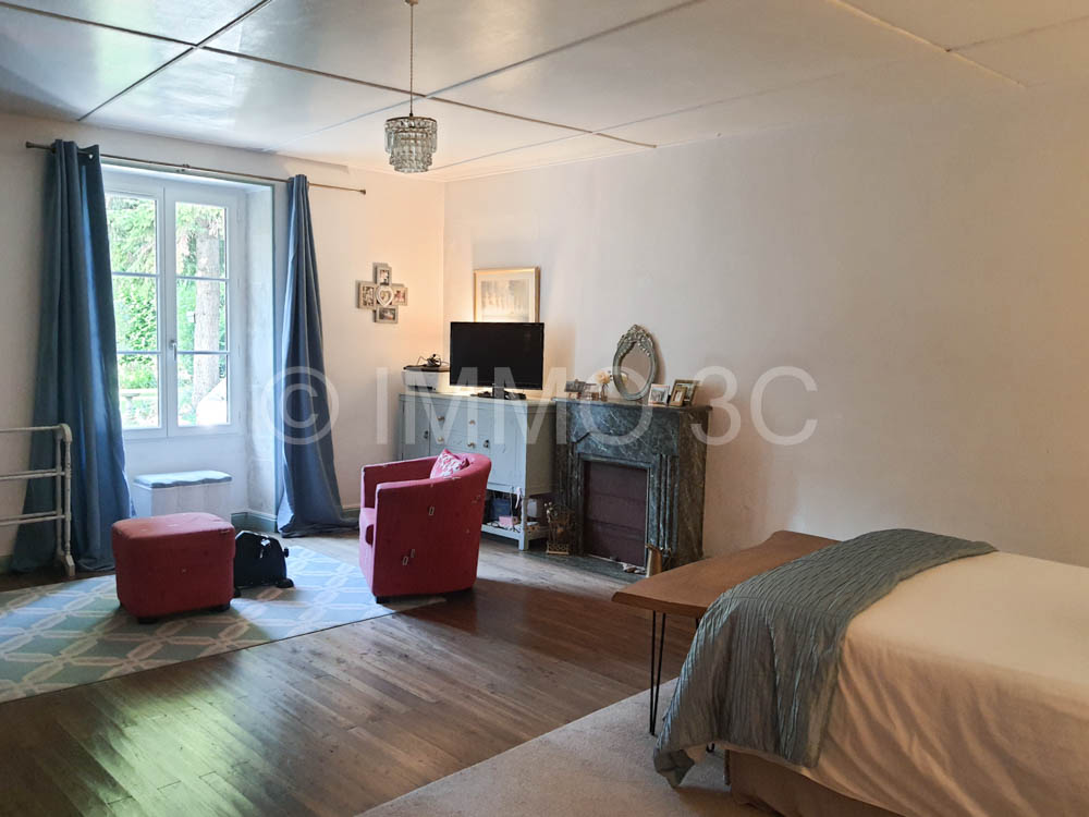 On the ground floor, the entrance sets the tone with its period features — original stone slabs, an eye-shaped window, a stone sink, and a traditional staircase leading to the upper floor. The fitted kitchen of 24 m² with a stone fireplace and a wood-burning stove. A shower room with WC, and a spacious 34 m² living room with original parquet flooring, exposed beams, and a period fireplace. Adjacent to this, a large 31.6 m² bedroom features an elegant marble fireplace and original wooden flooring.