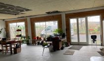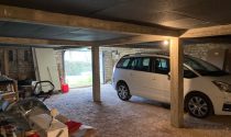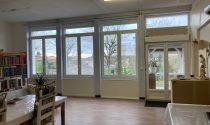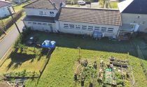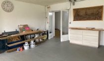 The former school courtyard is now a bright, enclosed workshop featuring large windows, and the property also includes an insulated garage.