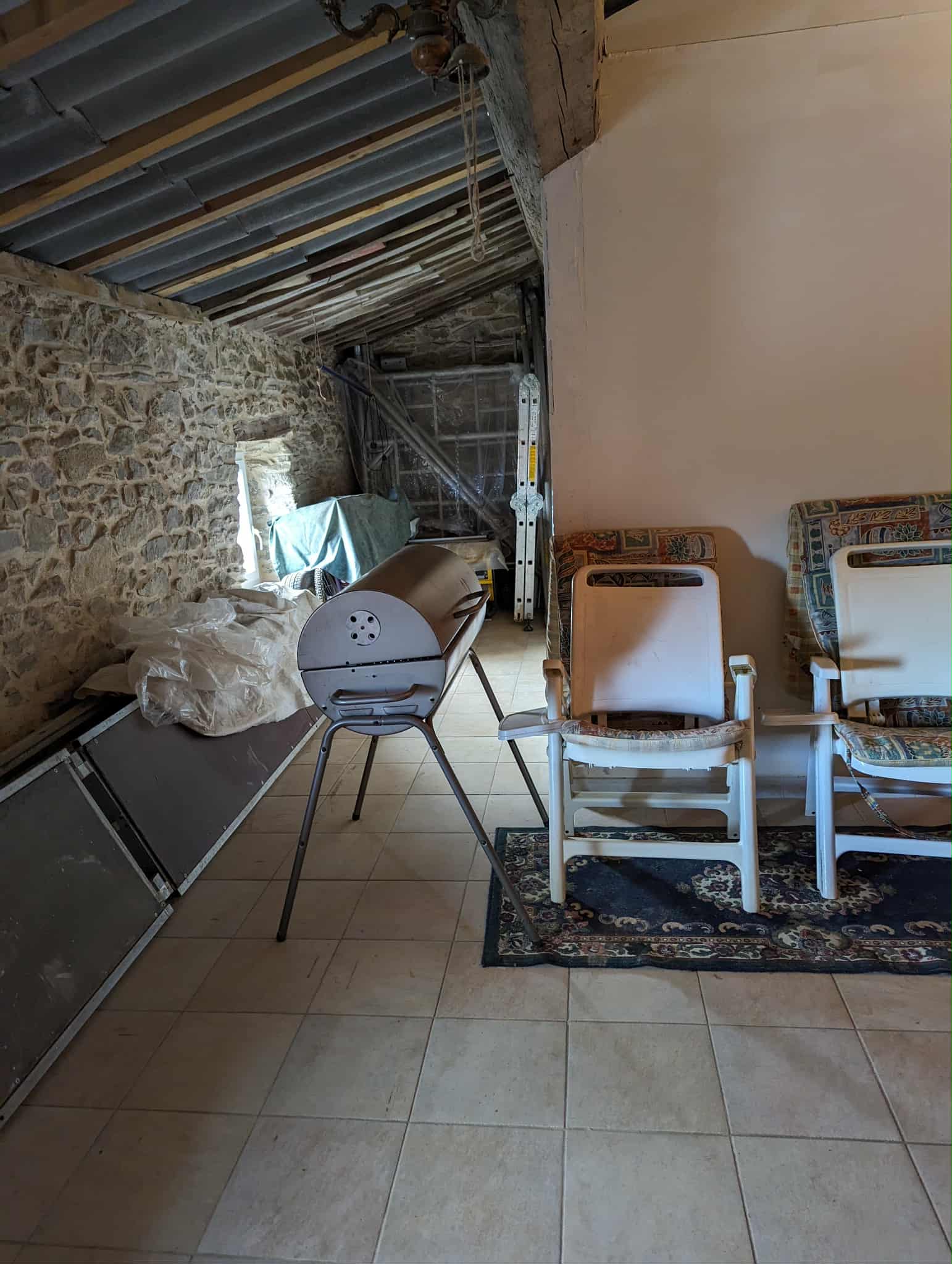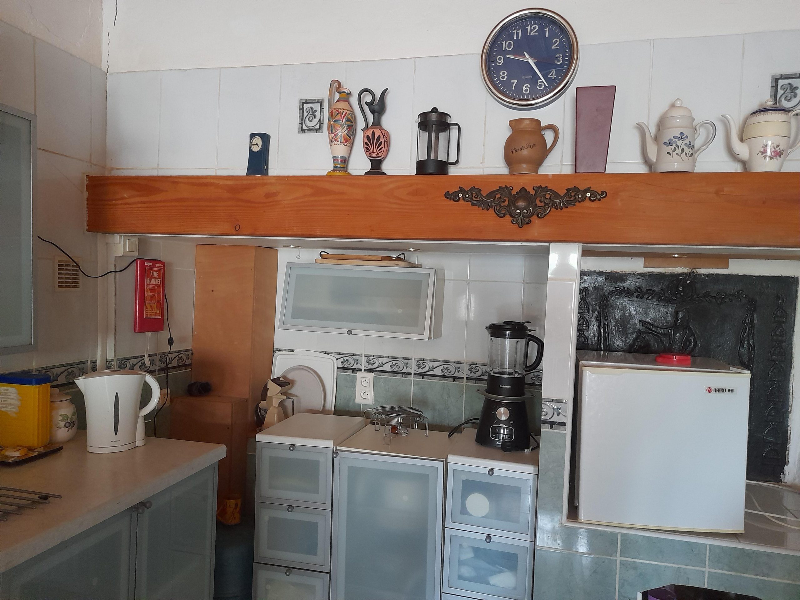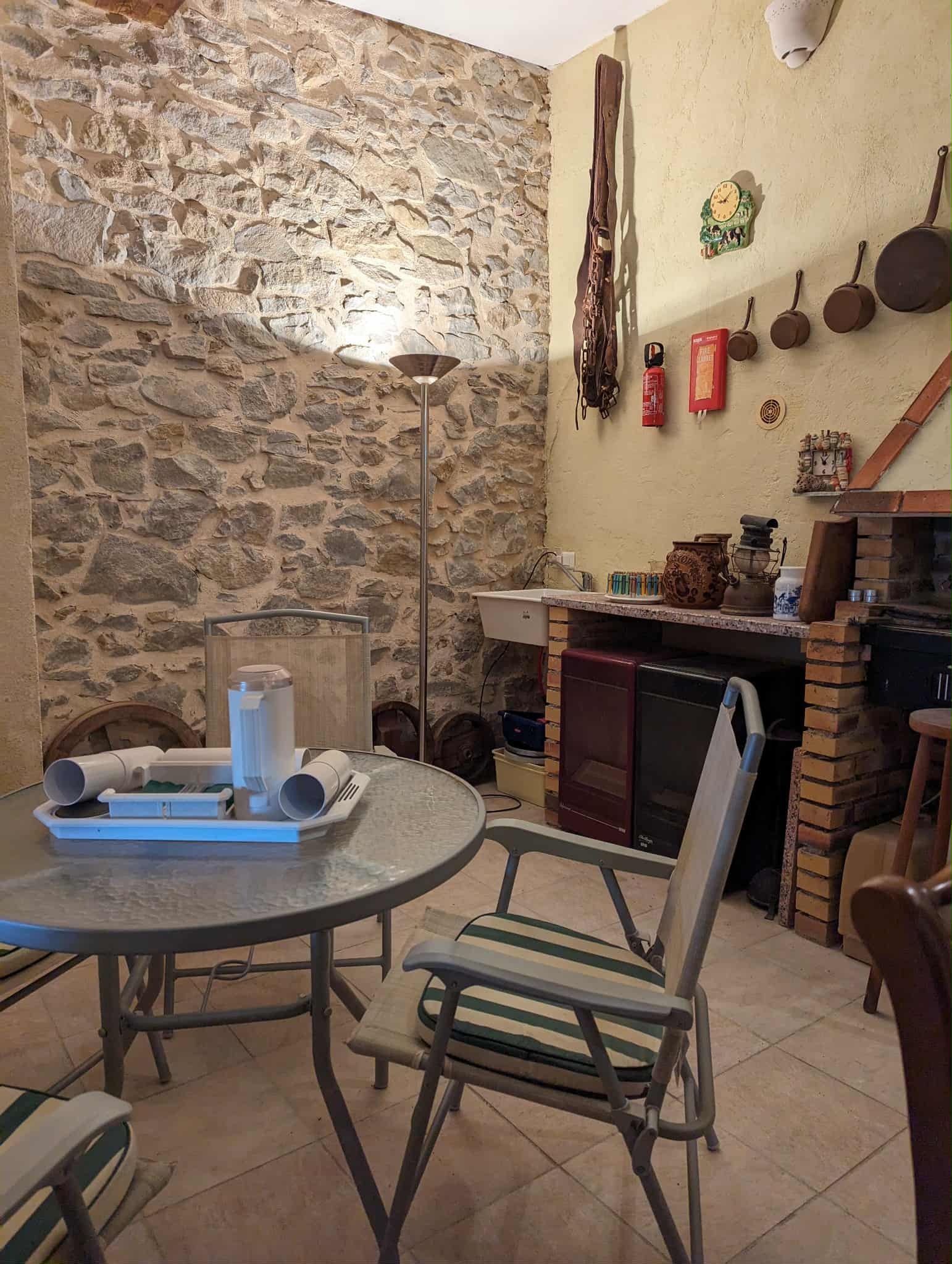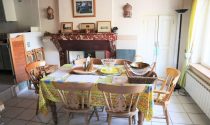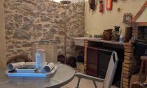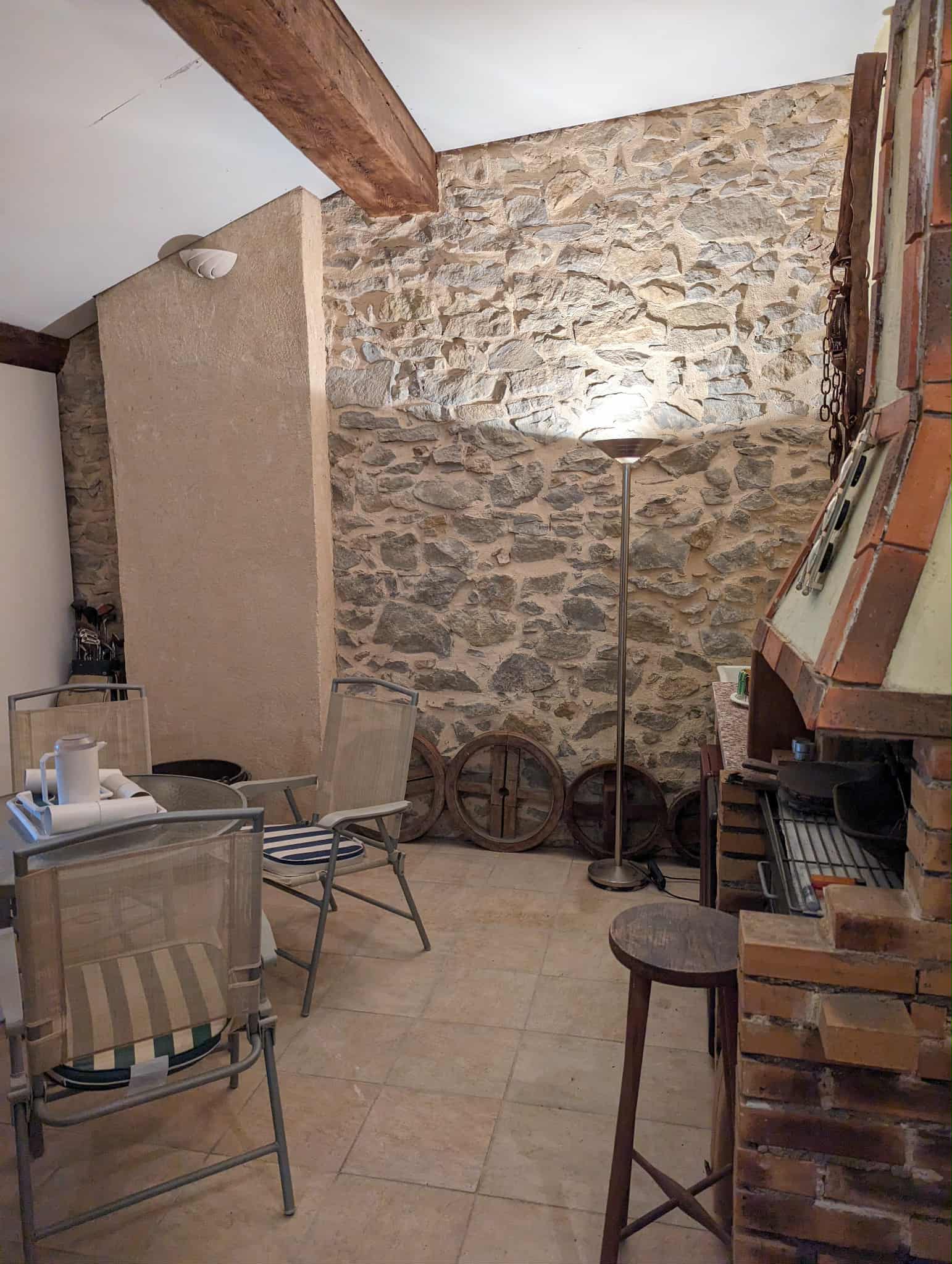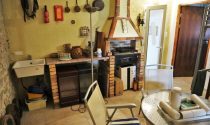 Kitchen and open chimney barbecue and a door leading to a terrace. Boiler room for oil fired central heating.