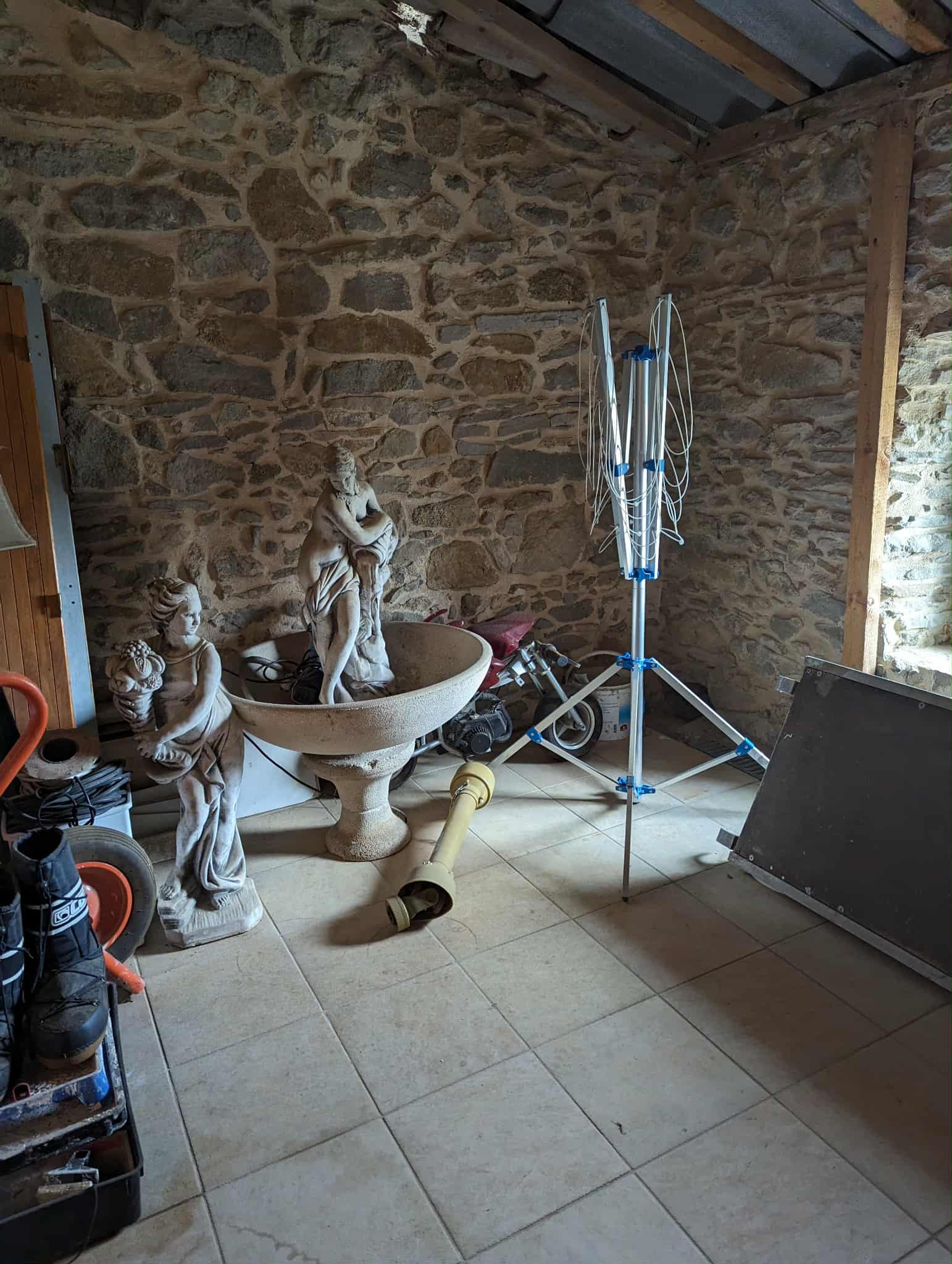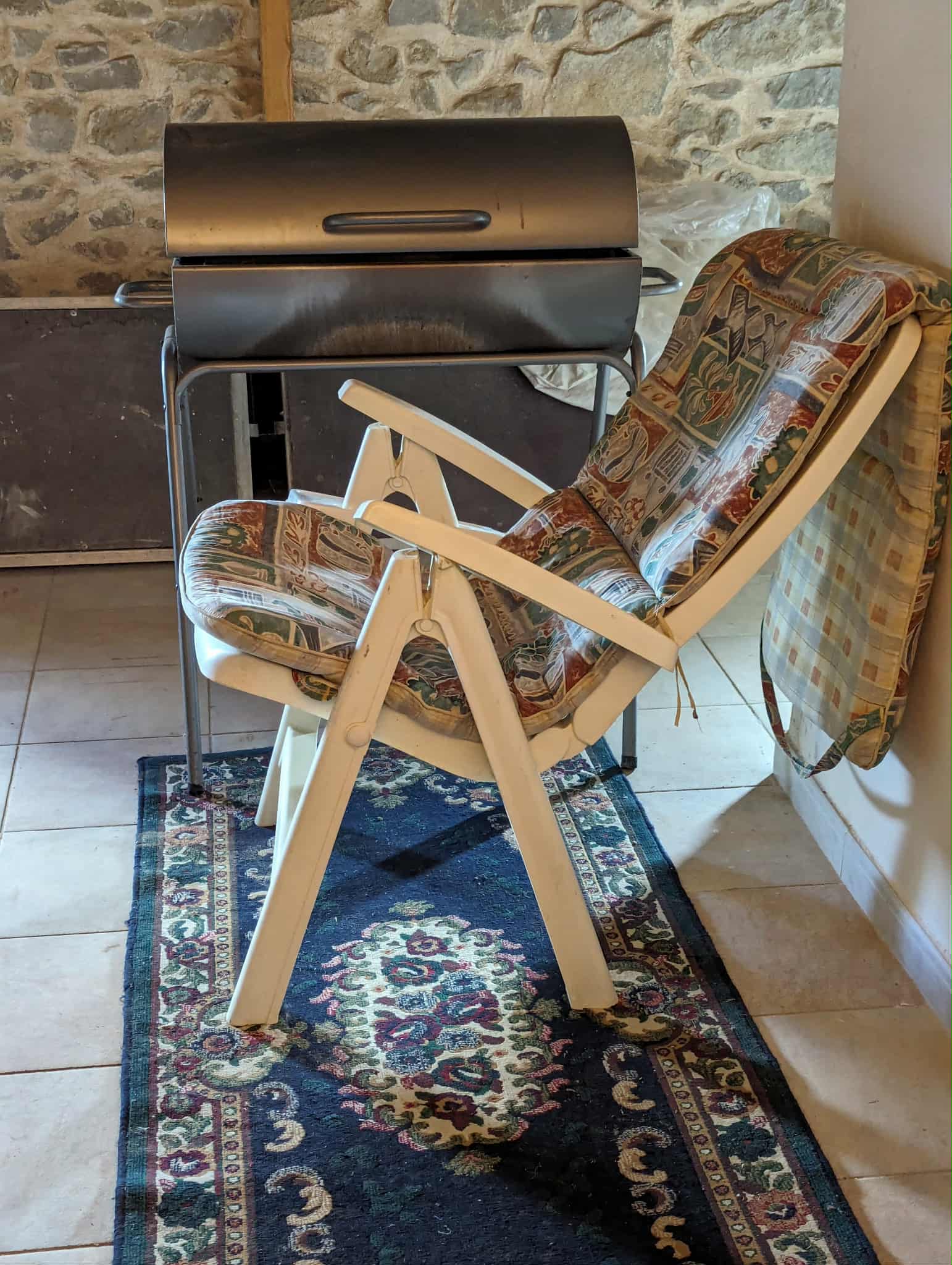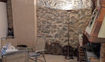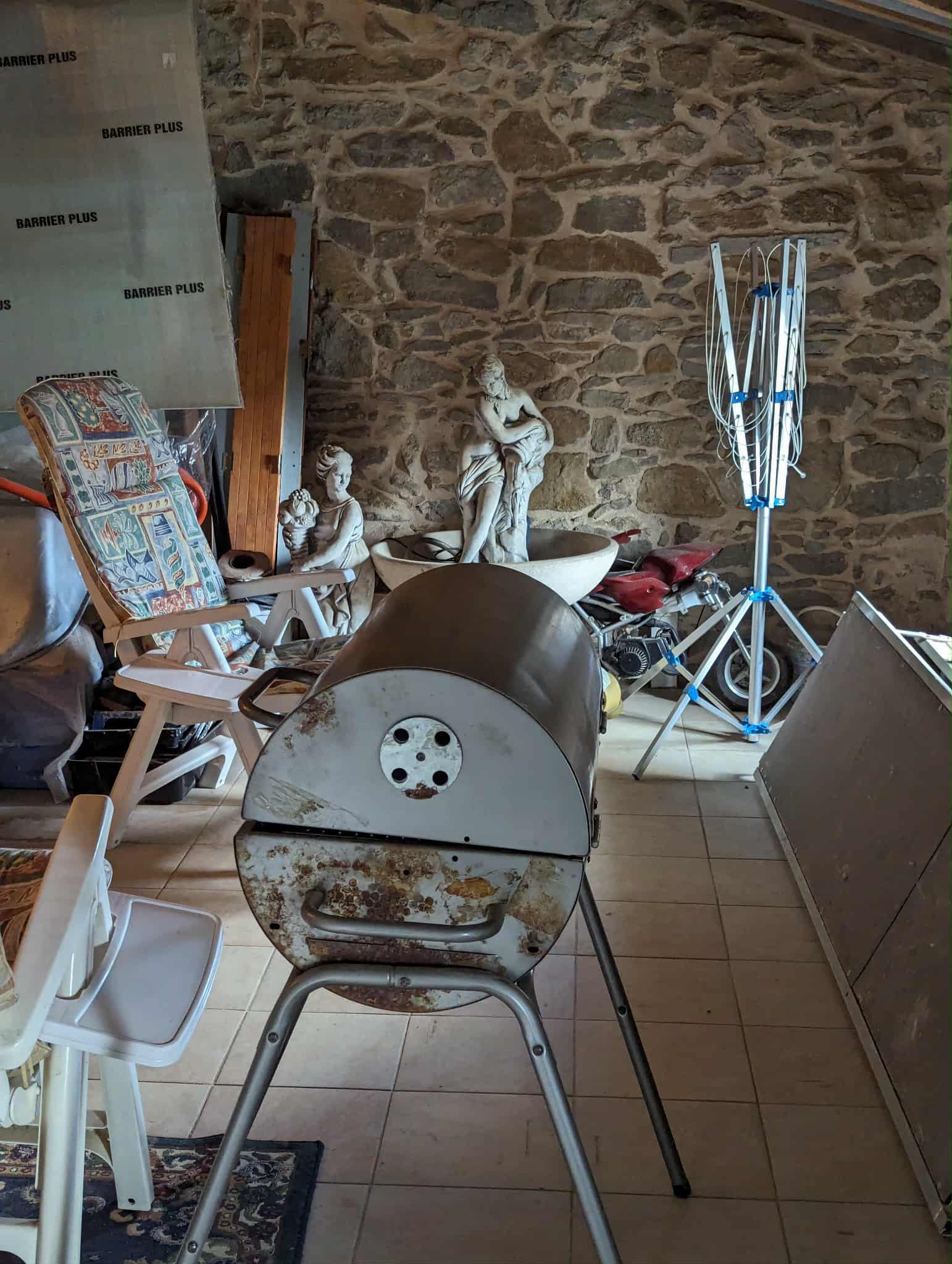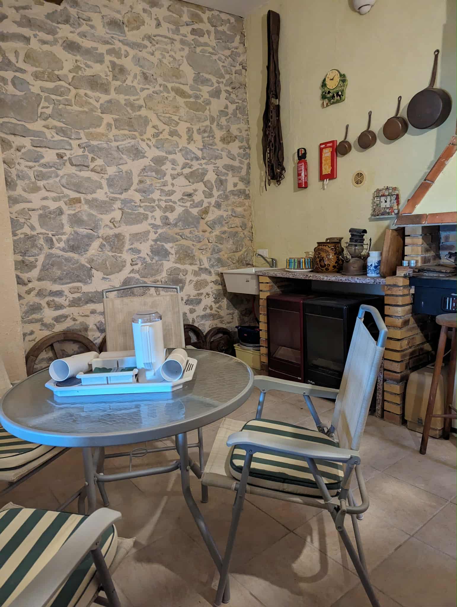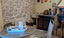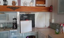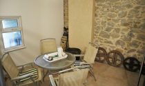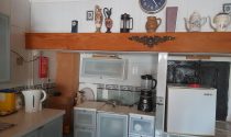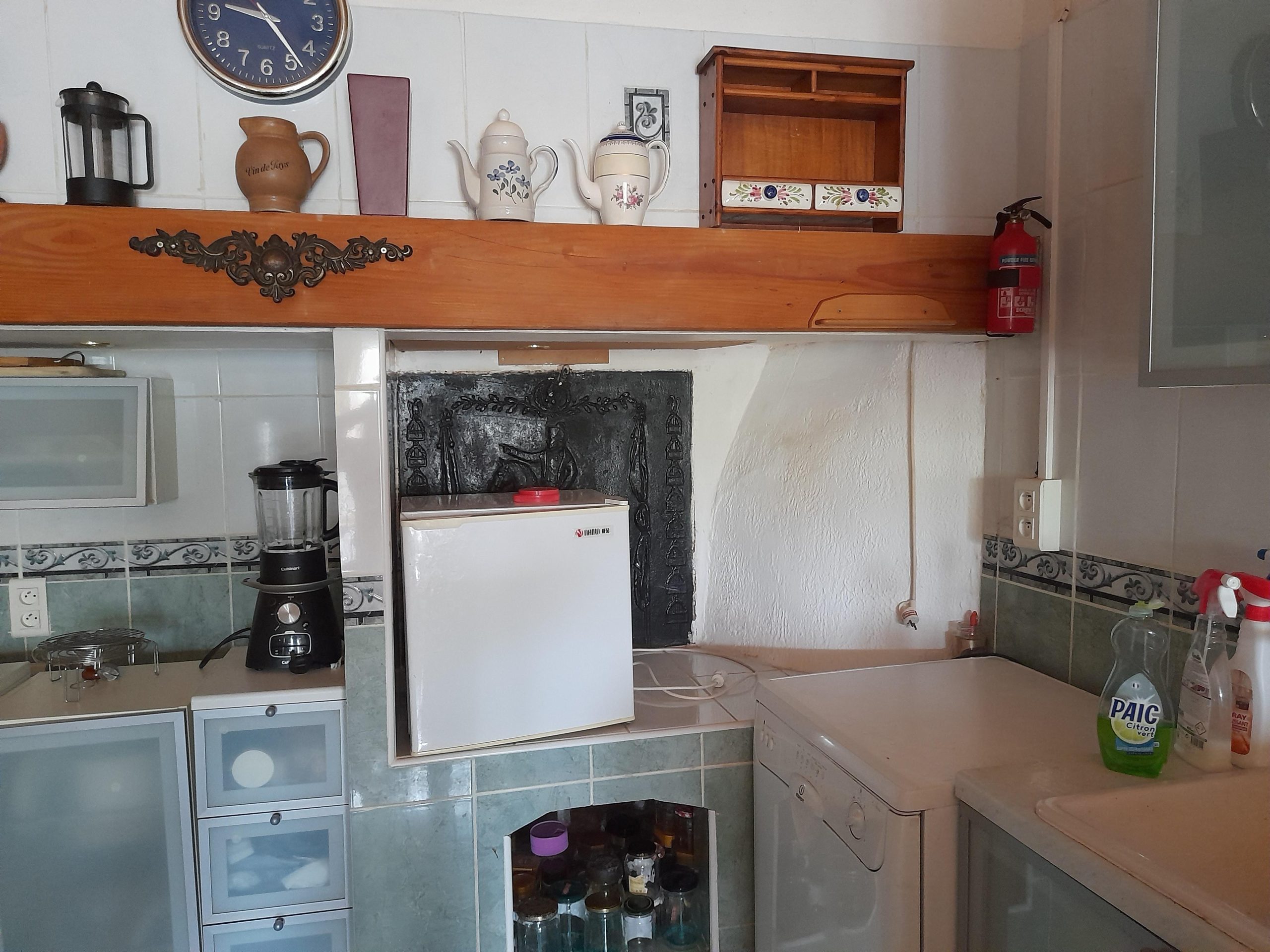 Kitchen and open chimney barbecue and a door leading to a terrace. Boiler room for oil fired central heating.
