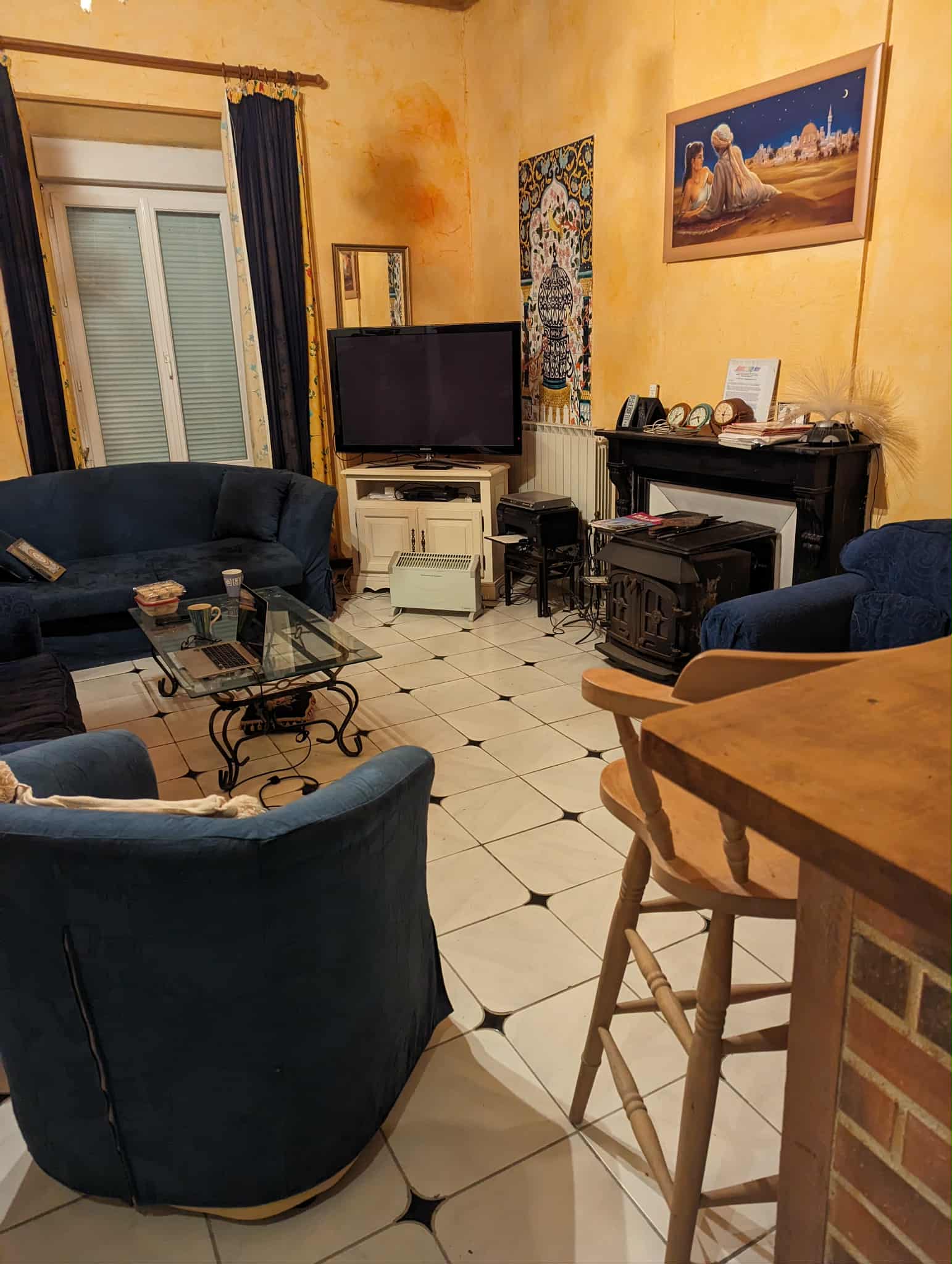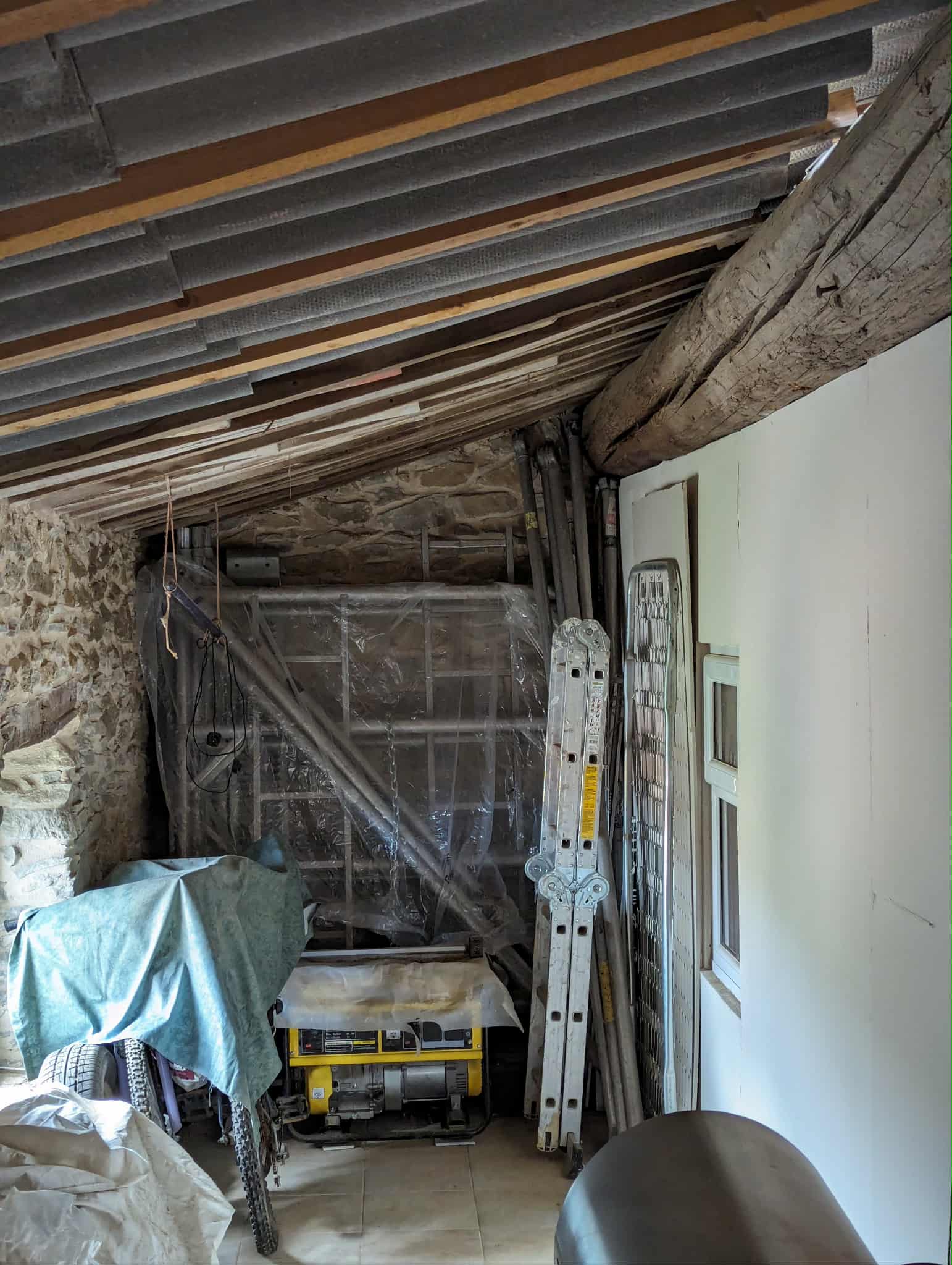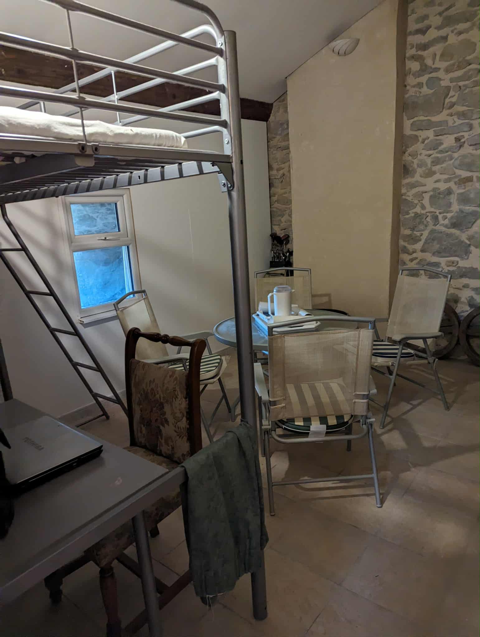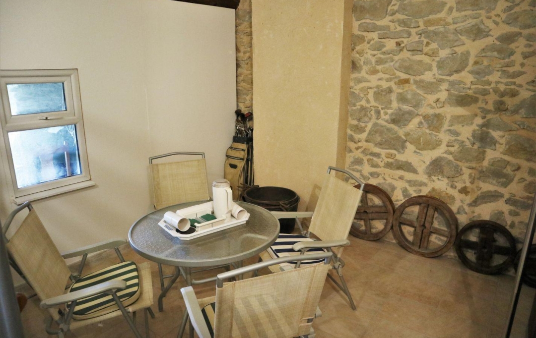 Kitchen and open chimney barbecue and a door leading to a terrace. Boiler room for oil fired central heating.
