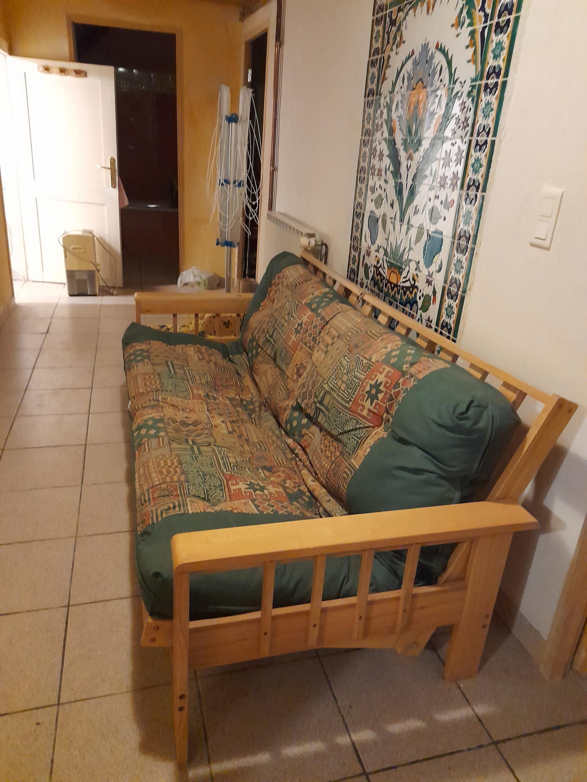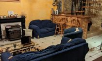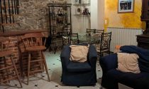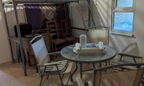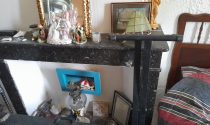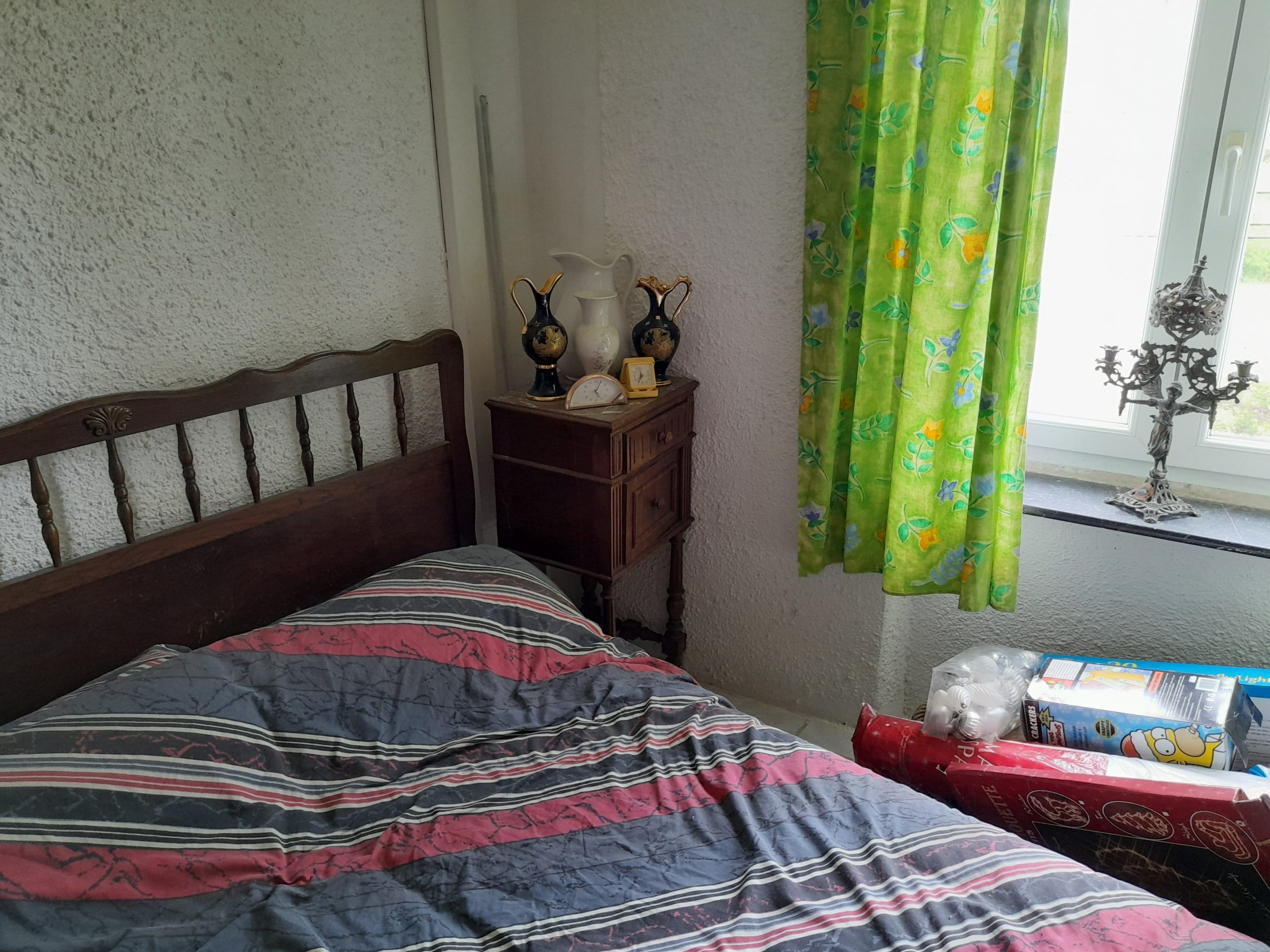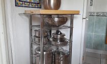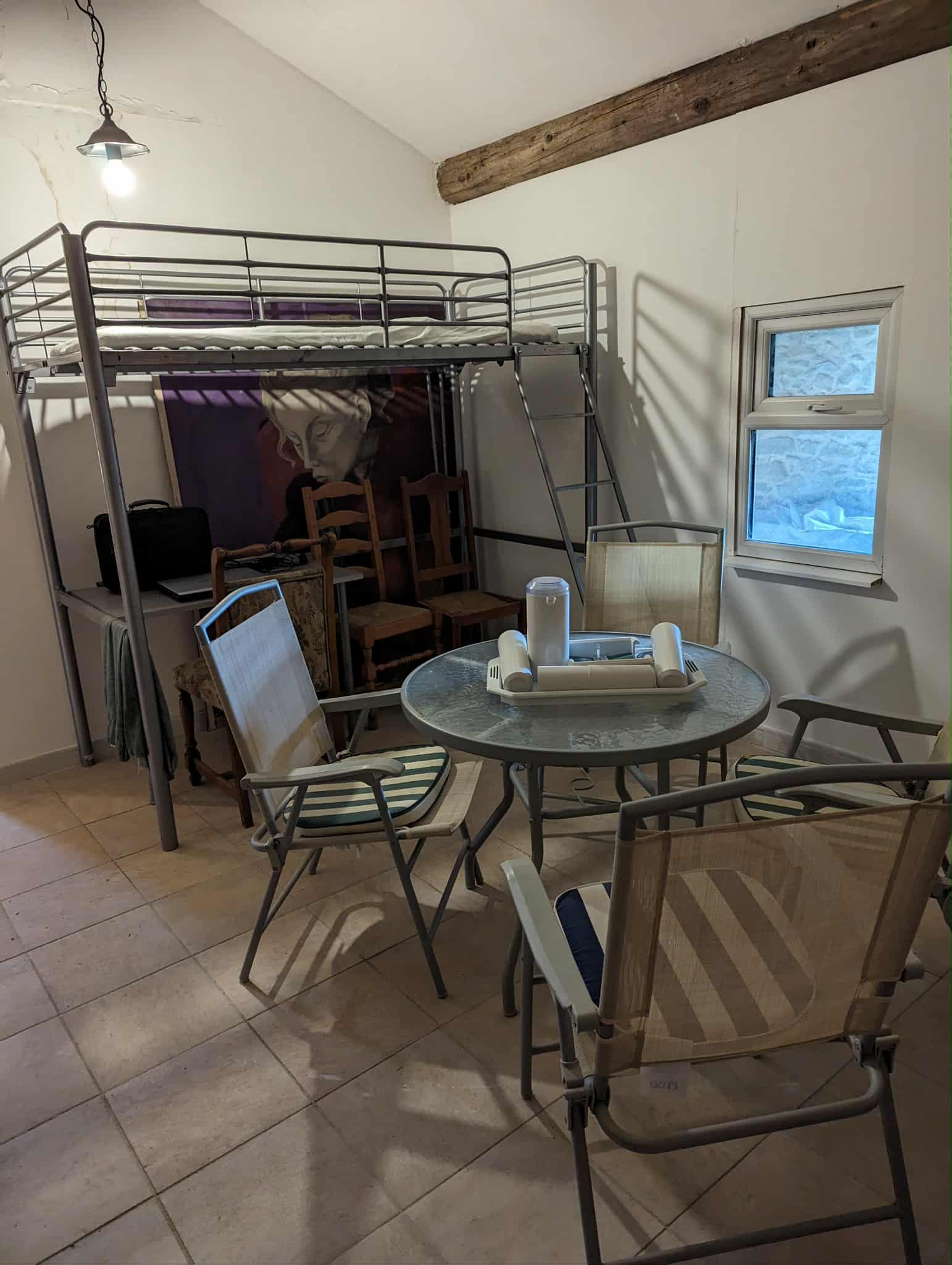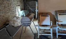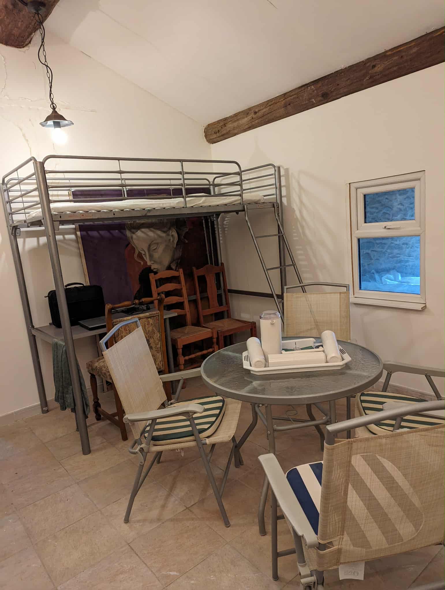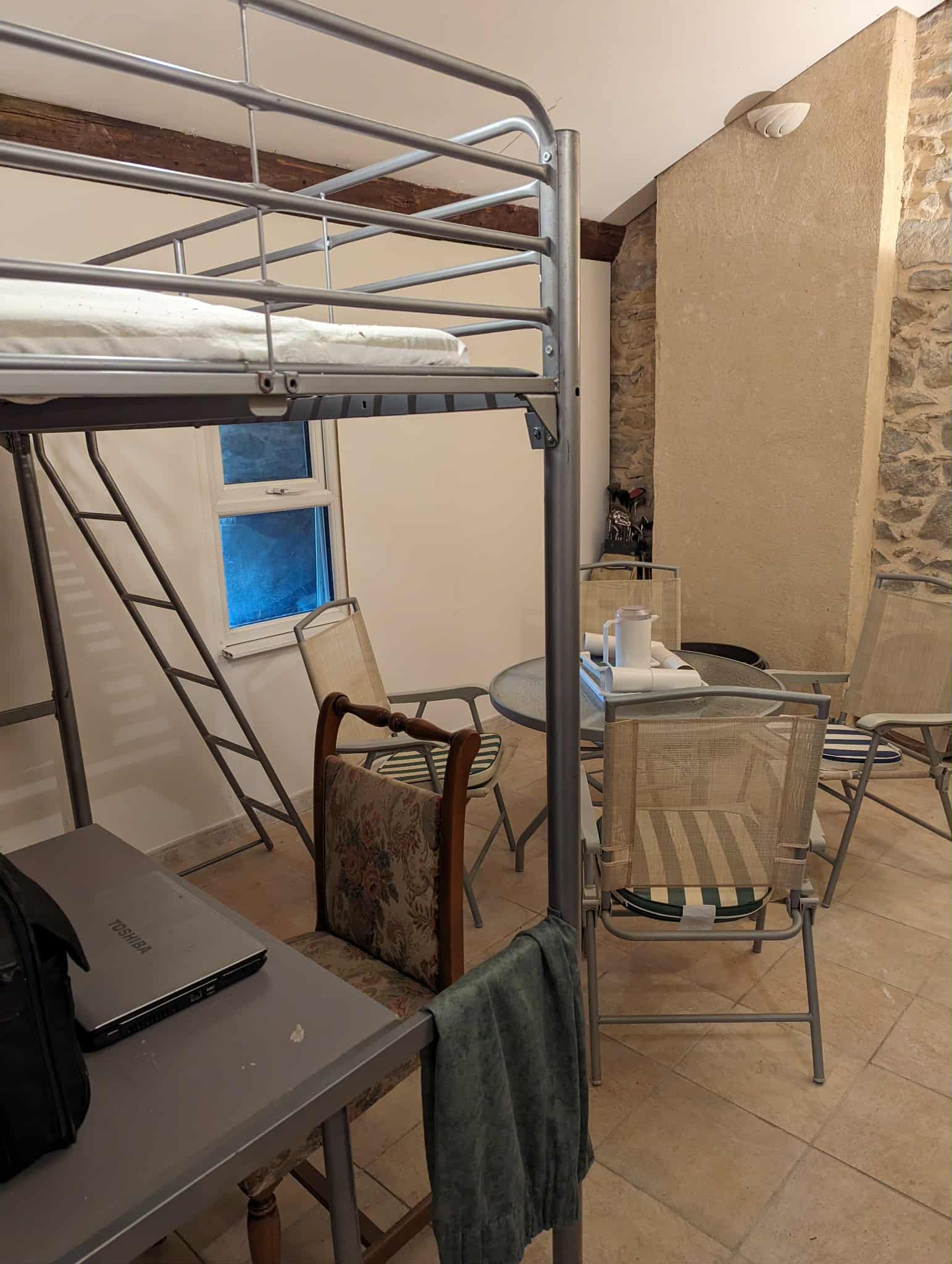 Kitchen and open chimney barbecue and a door leading to a terrace. Boiler room for oil fired central heating.