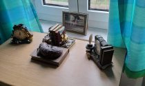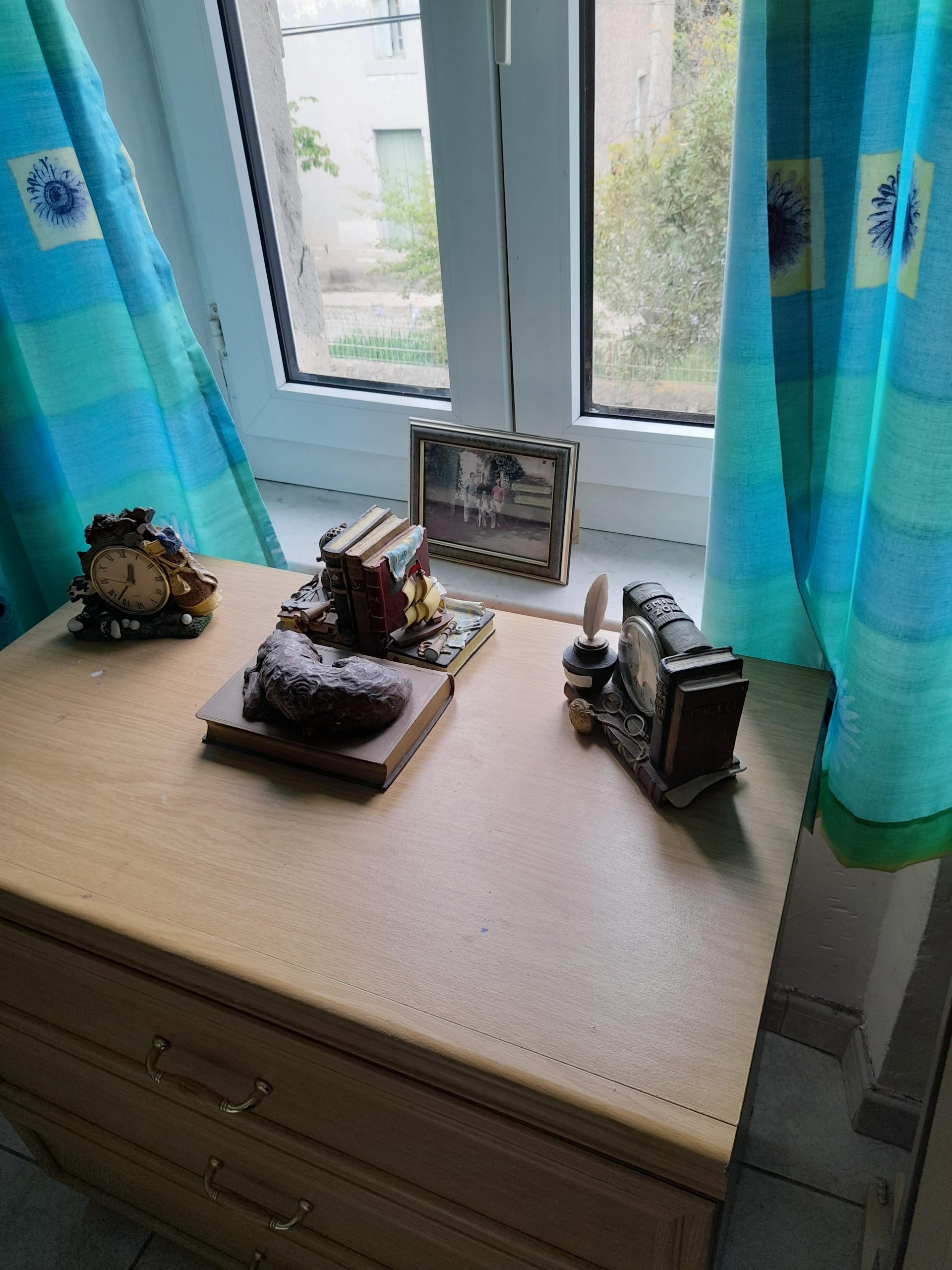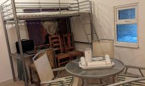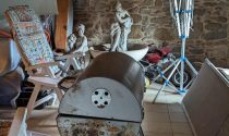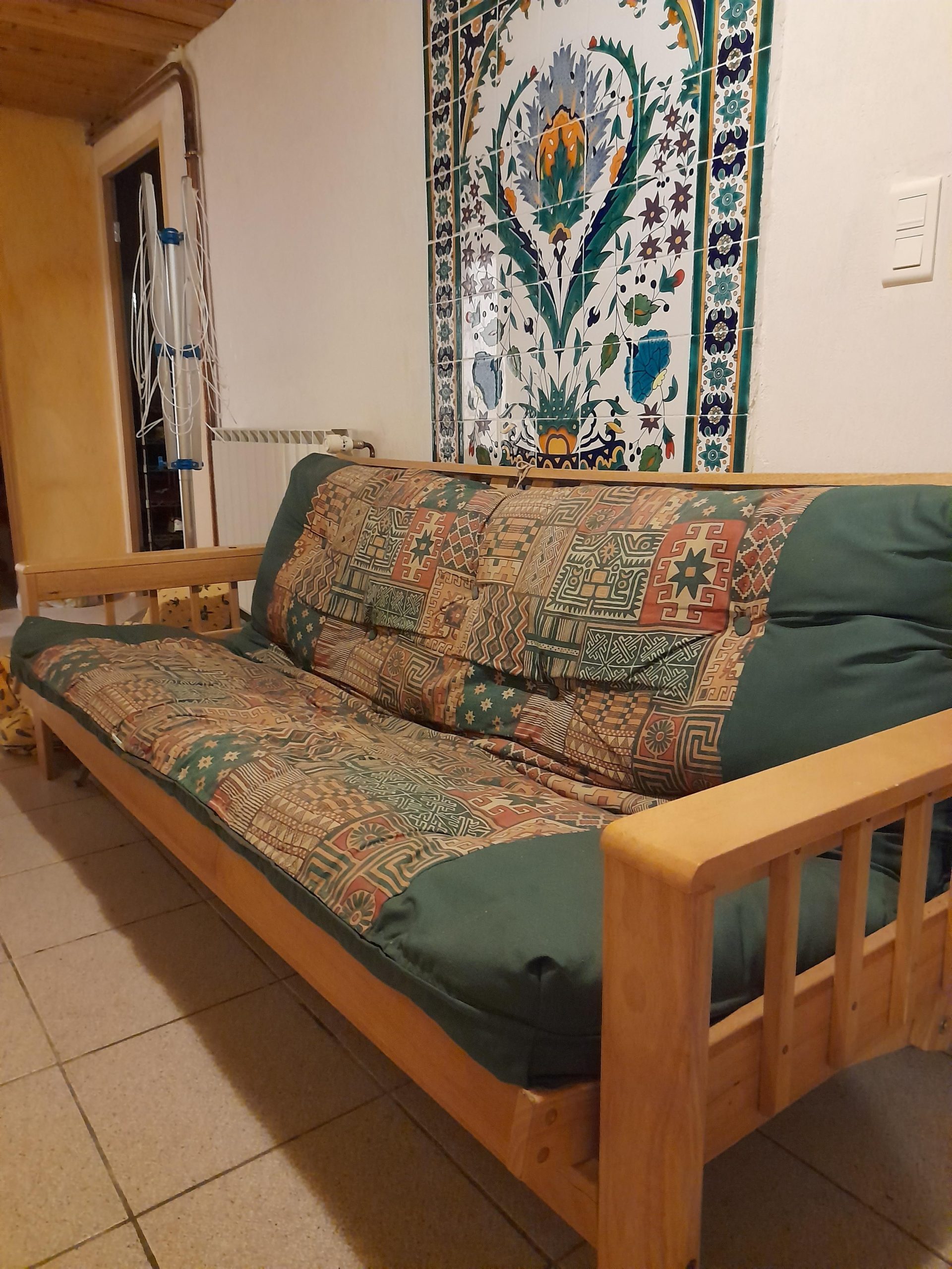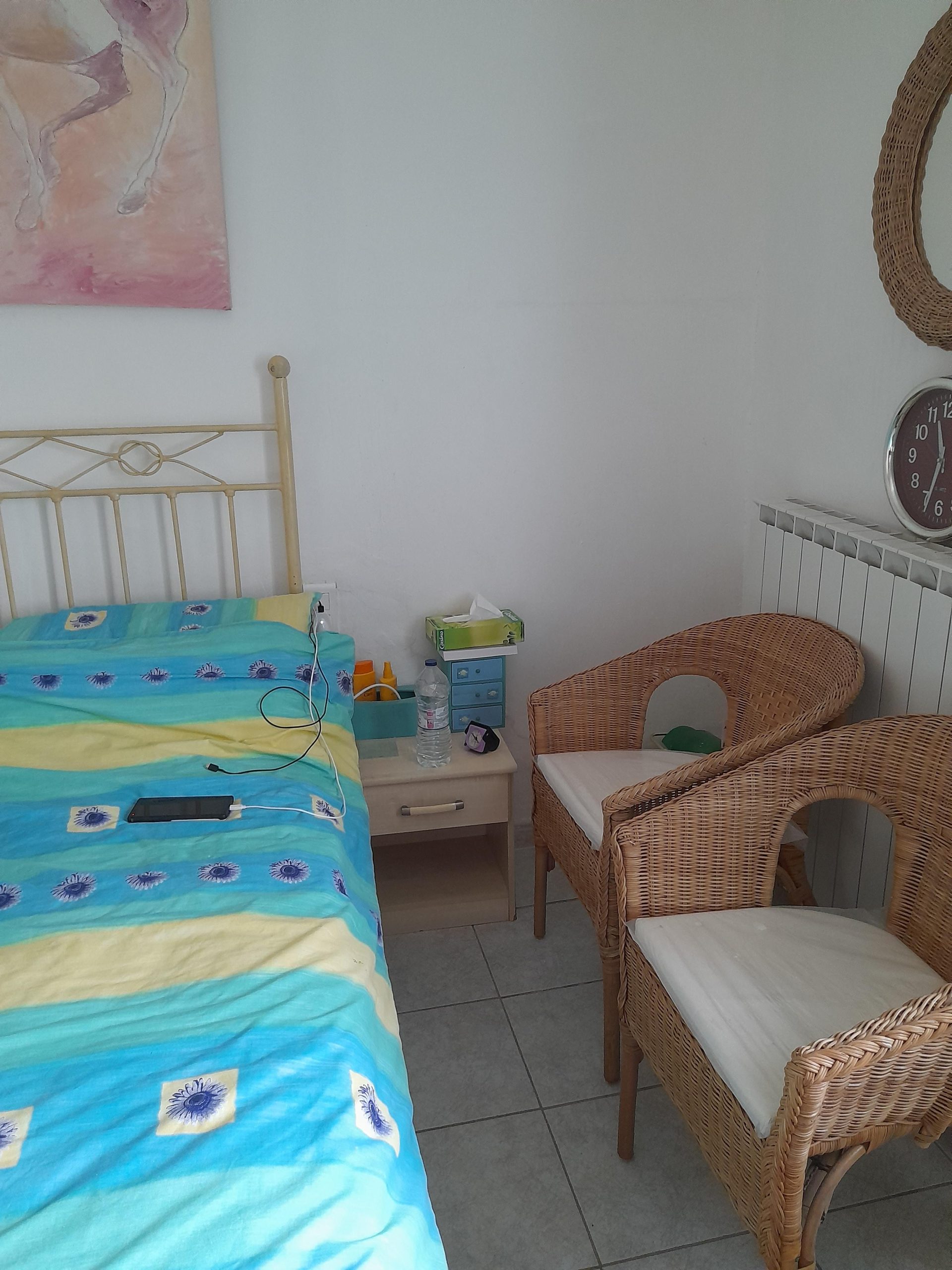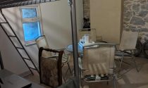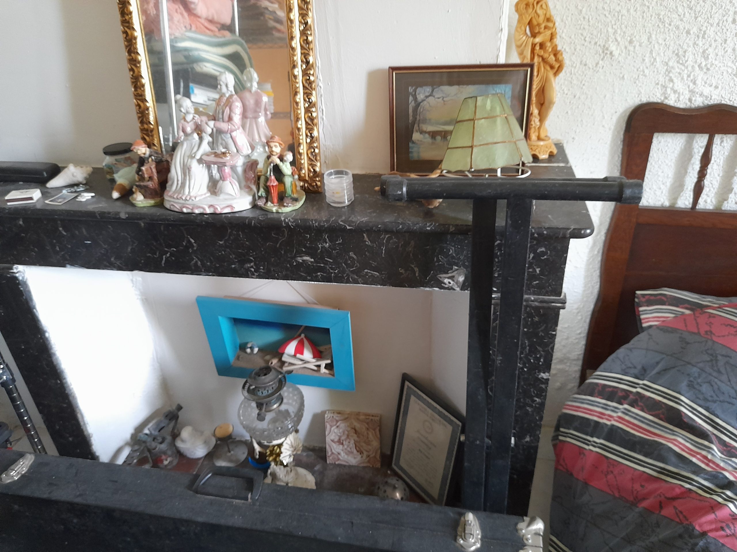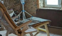 Kitchen and open chimney barbecue and a door leading to a terrace. Boiler room for oil fired central heating.