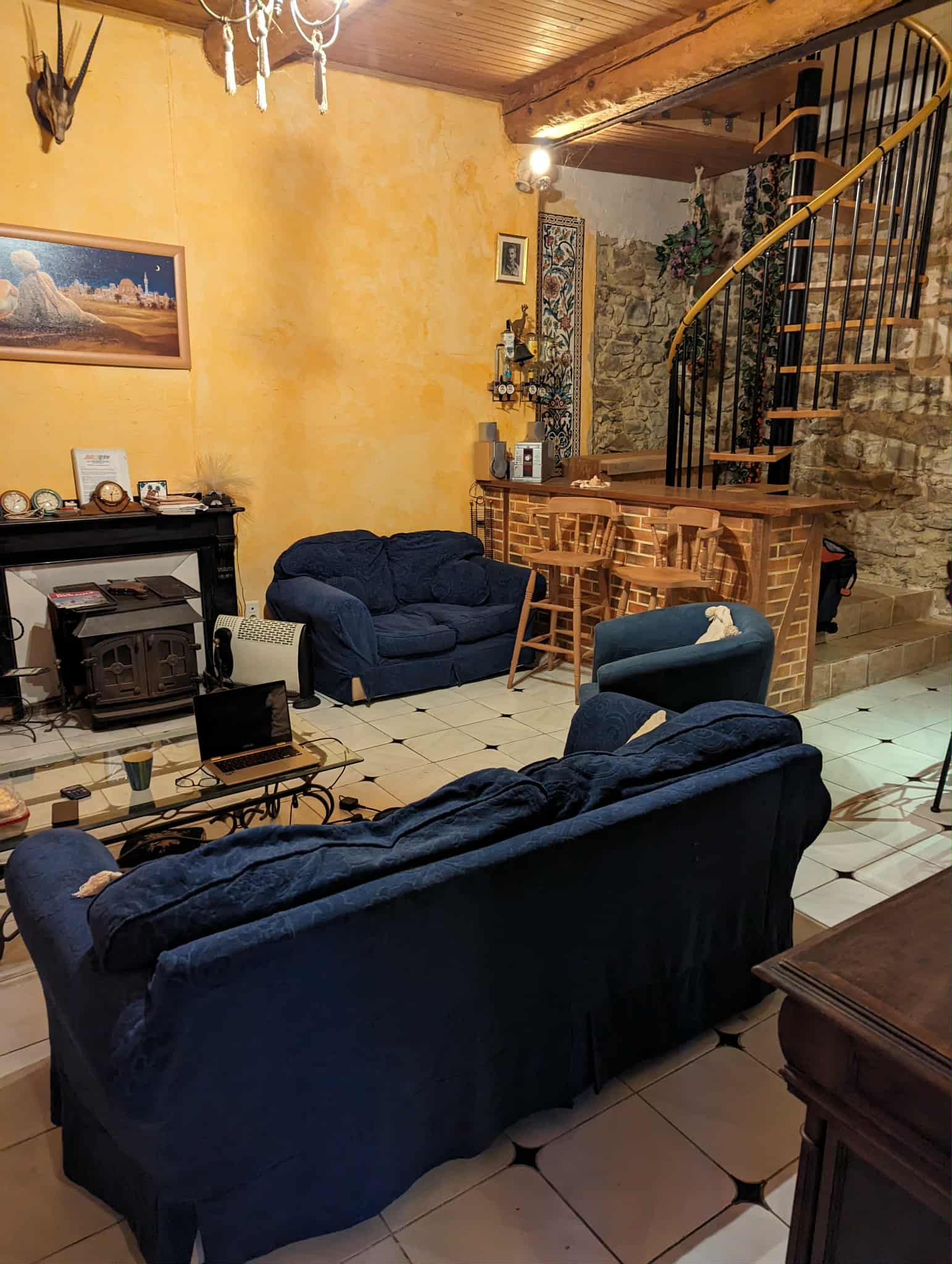 Large lounge with beams and spiral staircase leading to first floor.