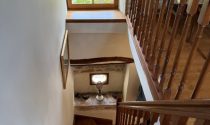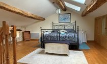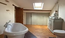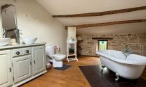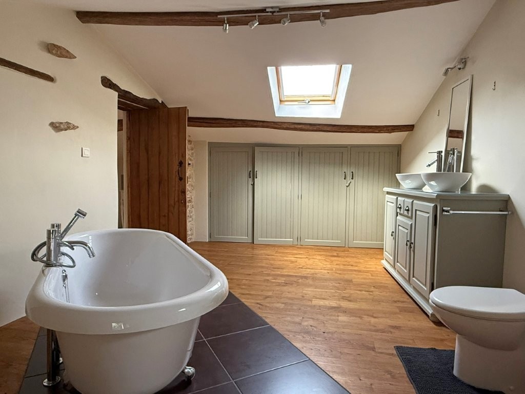 -Bathroom (17m²): wooden floor, double washbasin, WC, roll-top bath, velux window, storage under the eaves, exposed stonework