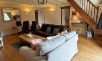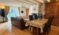 -Living room (35m²): chestnut floor, wood-burning stove, French window to front courtyard and door to garden, exposed stone walls and exposed beams