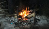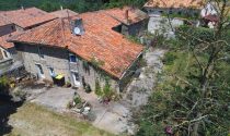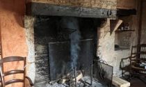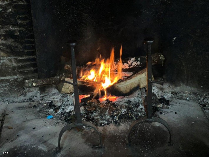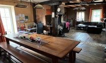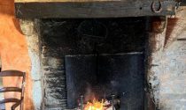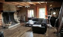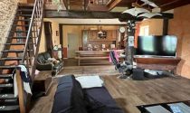 -Living room (65m²): wooden floor, open fireplace, exposed beams and stone