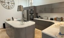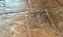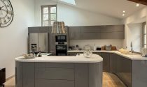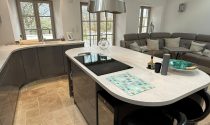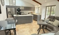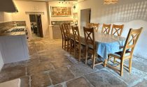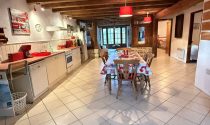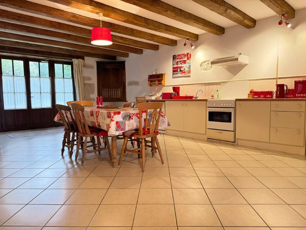 -Kitchen / Dining room (30m²): flagstone floor, wood burner, exposed beams, fitted