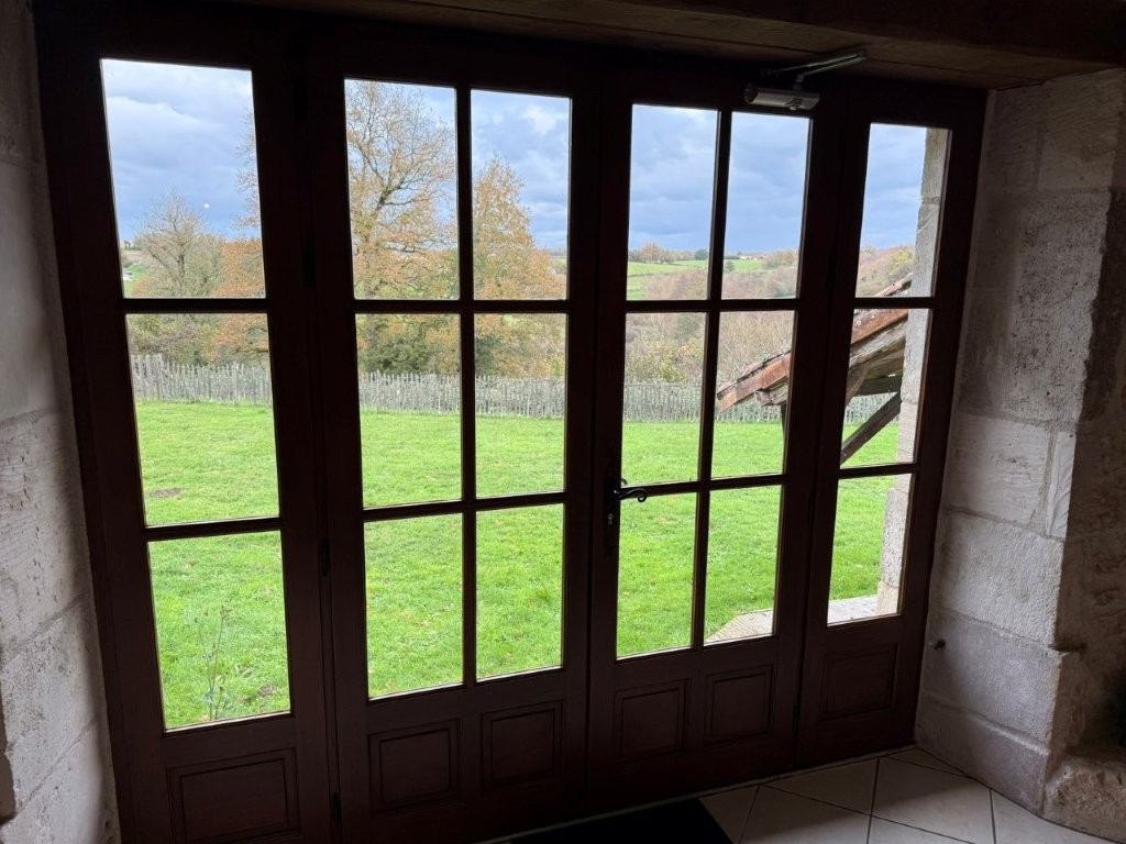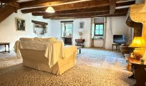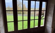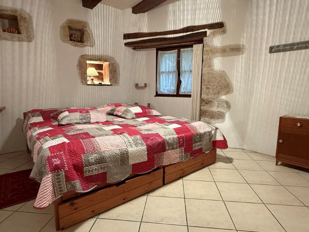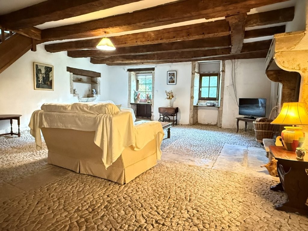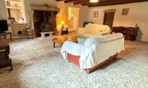 -Living room (40m²): tiled floor, fitted, exposed beams, exposed stone walls opening in the lounge (24m²): tiled floor, French windows, exposed beams, exposed stone walls, cupboard.