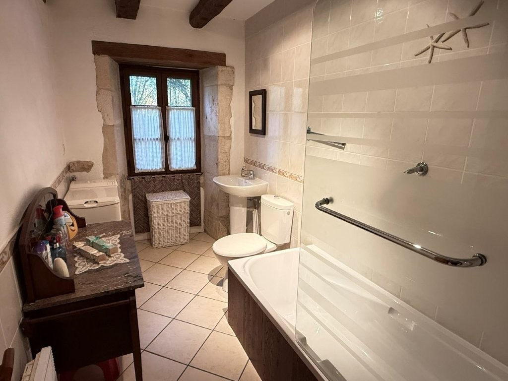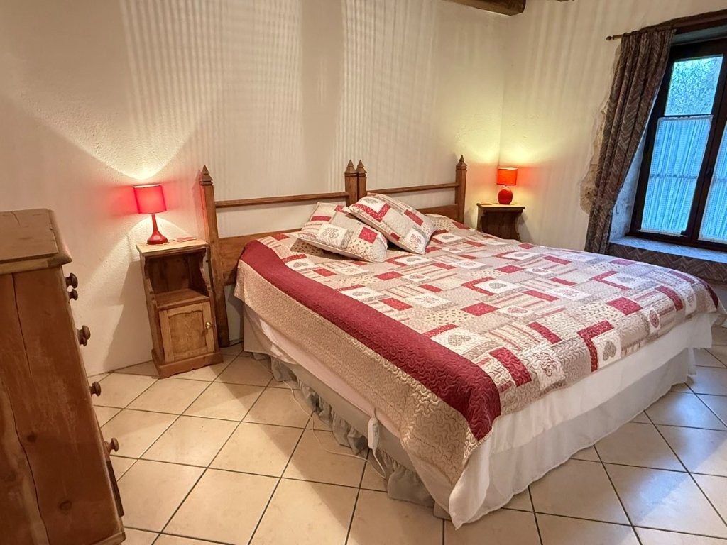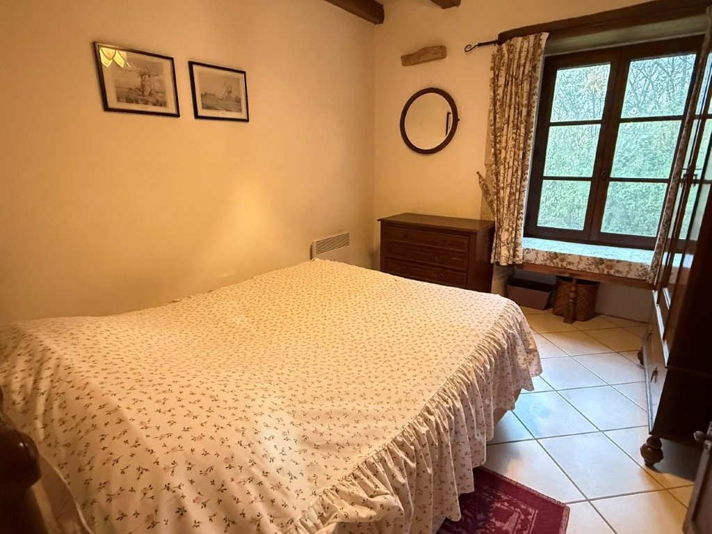 Continuing through the older part of the house, you arrive in the modern back kitchen and contemporary bathroom. A generous downstairs bedroom offers wonderful views down to the Cibiou river below, bringing natural beauty right to your doorstep. It would also be possible to separate this rear section of the house to create an independent annexe, complete with its own modern kitchen, bathroom, bedroom and with oil central heating.