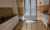 -Kitchen (11.26 m²): tiled floor, simple kitchen, French windows leading to the garden
