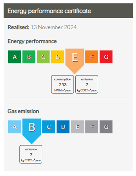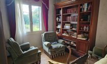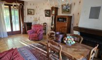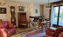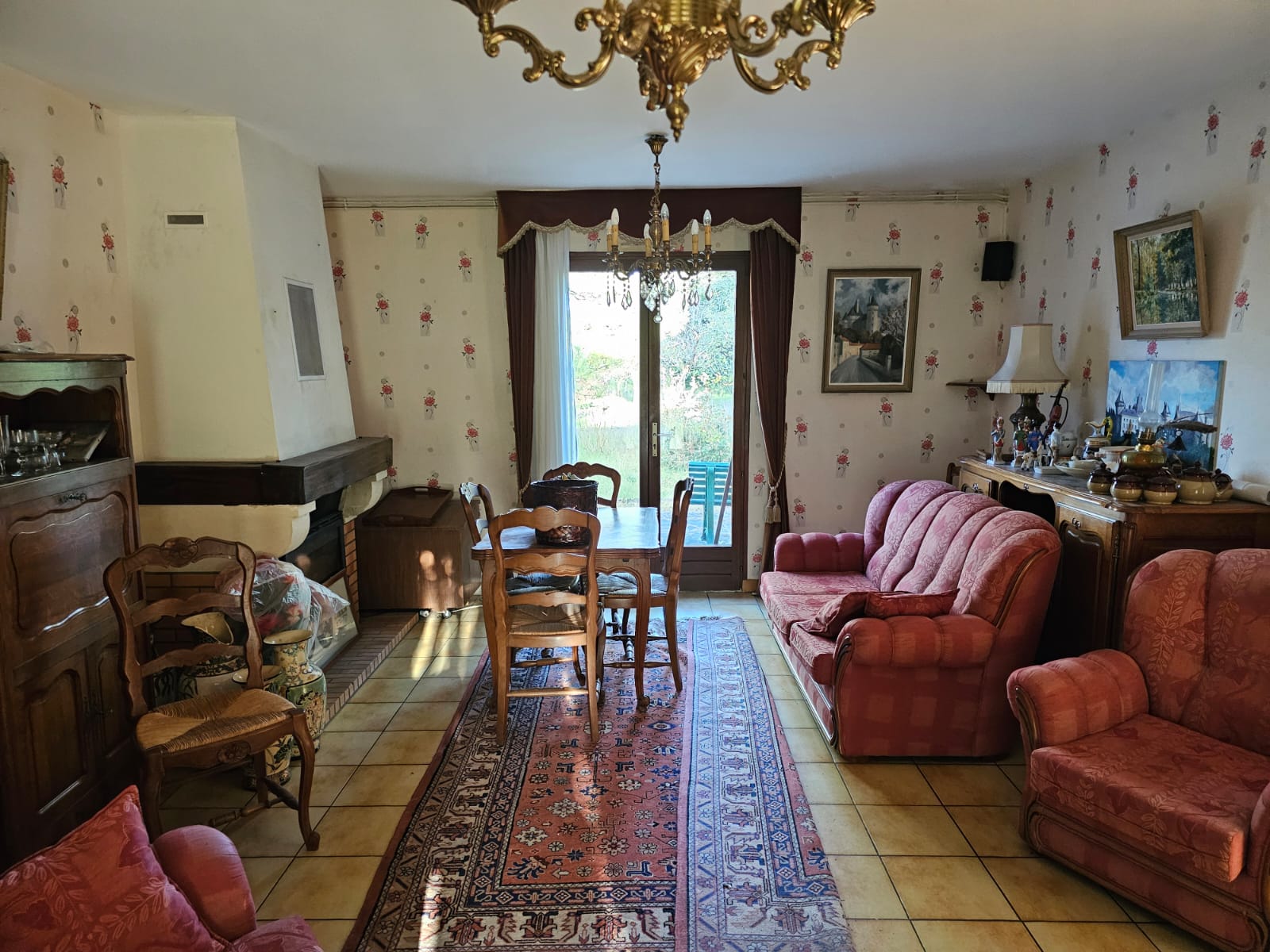 -Living/dining room (26.14 m²): tiled floor, French windows to the garden, fireplace with insert, French windows to the veranda