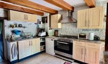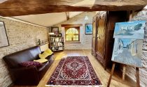 There's a second living room with garden access, a lovely old fireplace with a woodburner and an original old sink, just for decoration. The kitchen is modern and bright with access to the front garden and the large dining, living room. With its two spacious bedrooms upstairs, bright mezzanine, and peaceful gardens with outbuildings - this pretty stone house would make the perfect pied-à-terre or a family home with room to expand.