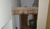 -Lounge (32.50m²): tiled floor, French window, open fireplace, exposed stonework