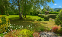 An attached garage, accessible from the living room, could be the starting point for a separate gîte (replace the garage doors with sliding glass doors). Stairs in the garage lead to a mezzanine and also to the upper floor of the house, where there are three more rooms, two interconnecting and one with a water connection, a storage room, and a small utility room. Ideal for a gîte.