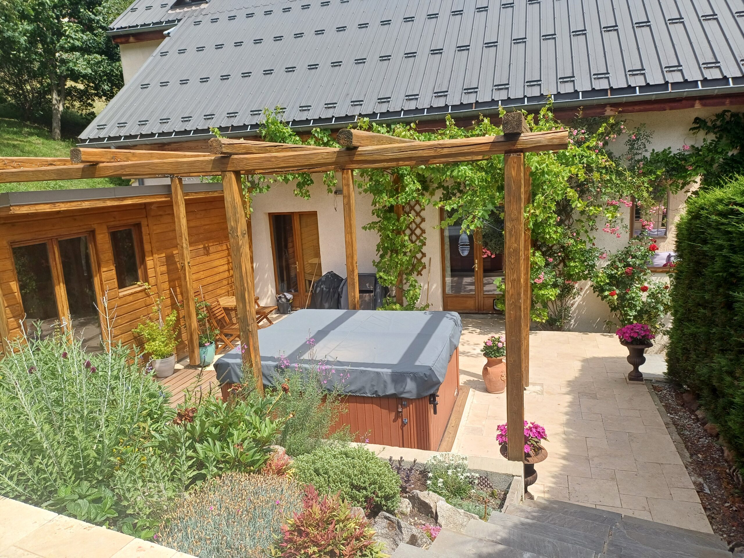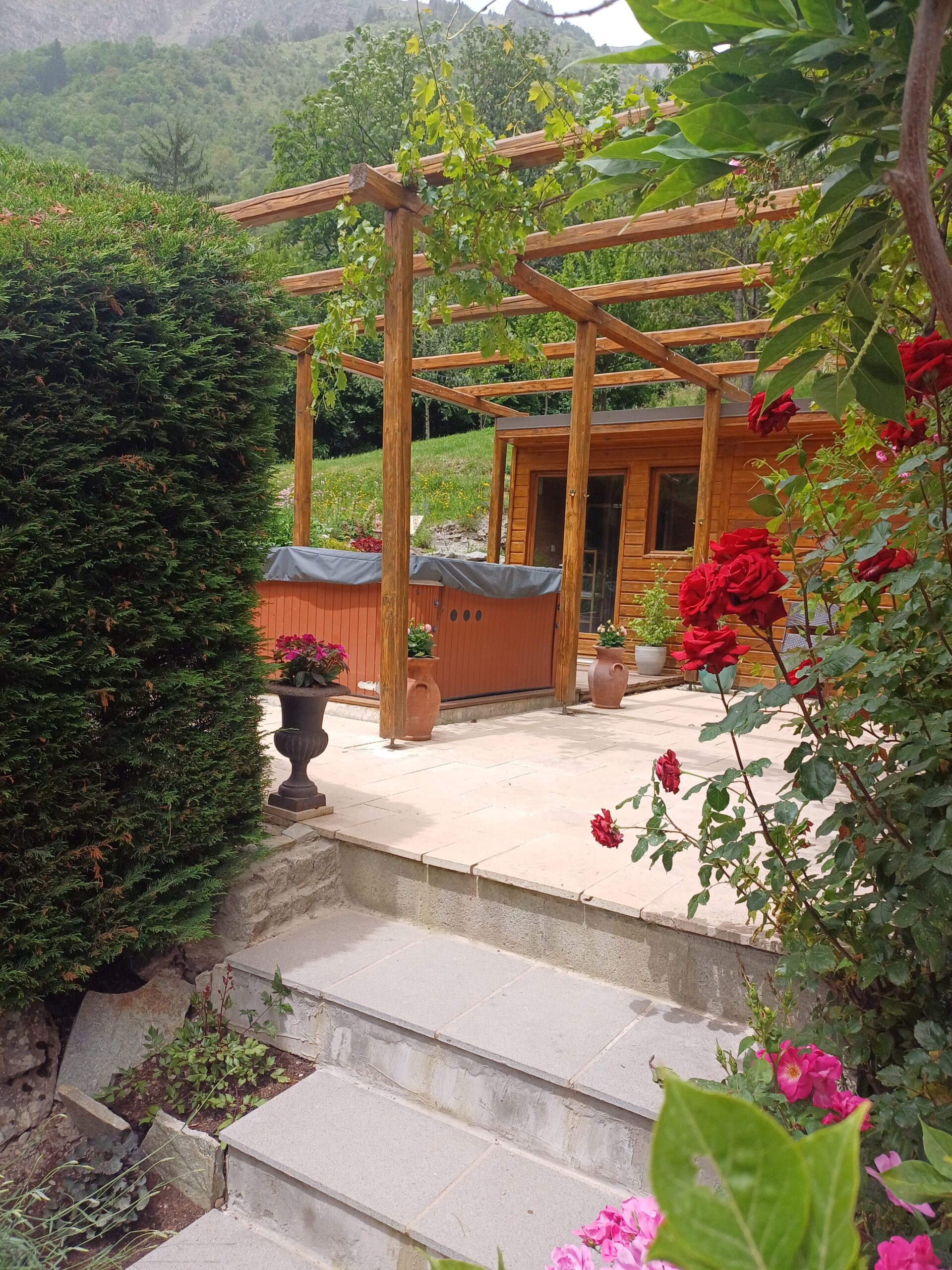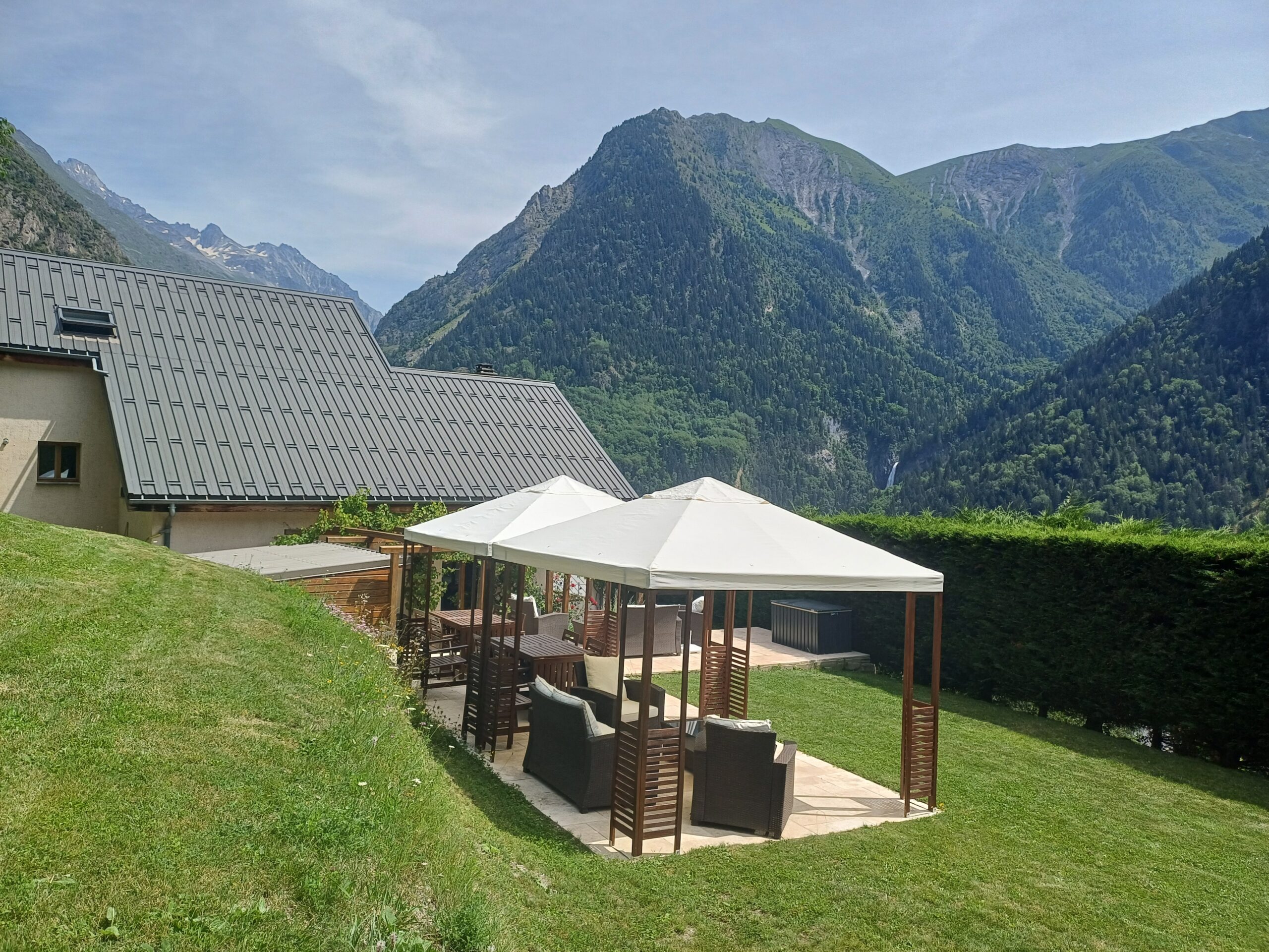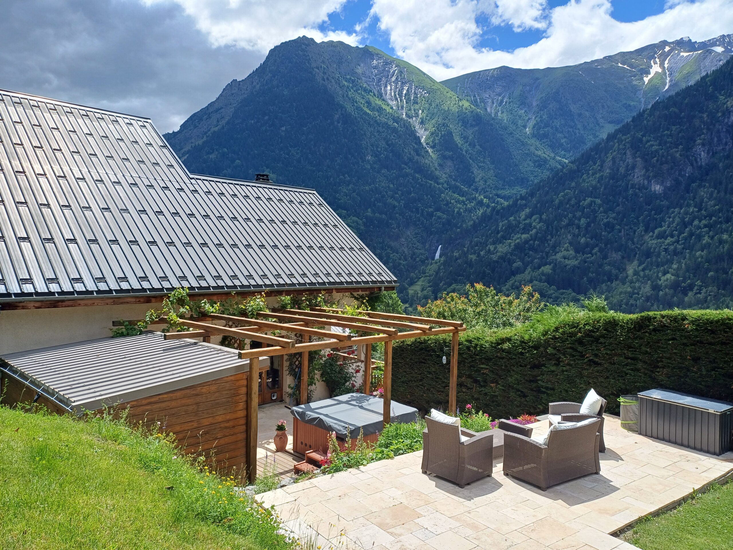 The property includes an extensive private mature garden which includes constructable land (about 800m2). This land would be ideal for a large swimming pool with spectacular views across to the Muzelle glacier. The garden is currently terraced, with two areas paved in travertine giving access to a hot tub and infrared sauna. The location could not be more special. There is also private off street parking at the front of the chalet for 3-4 vehicles.
