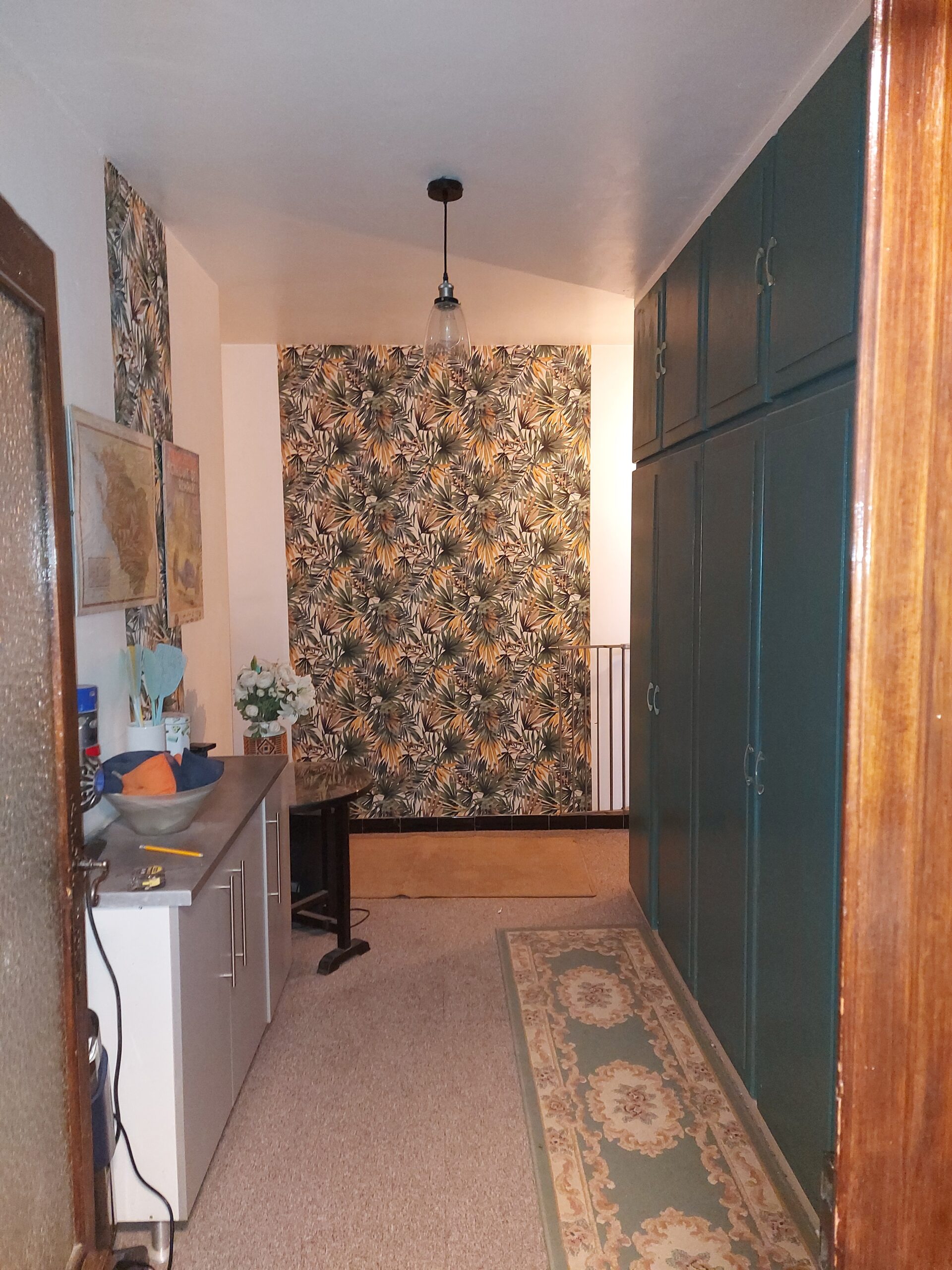 Hallway / Entrance (12 m²): carpet over tile, useful storage cupboards