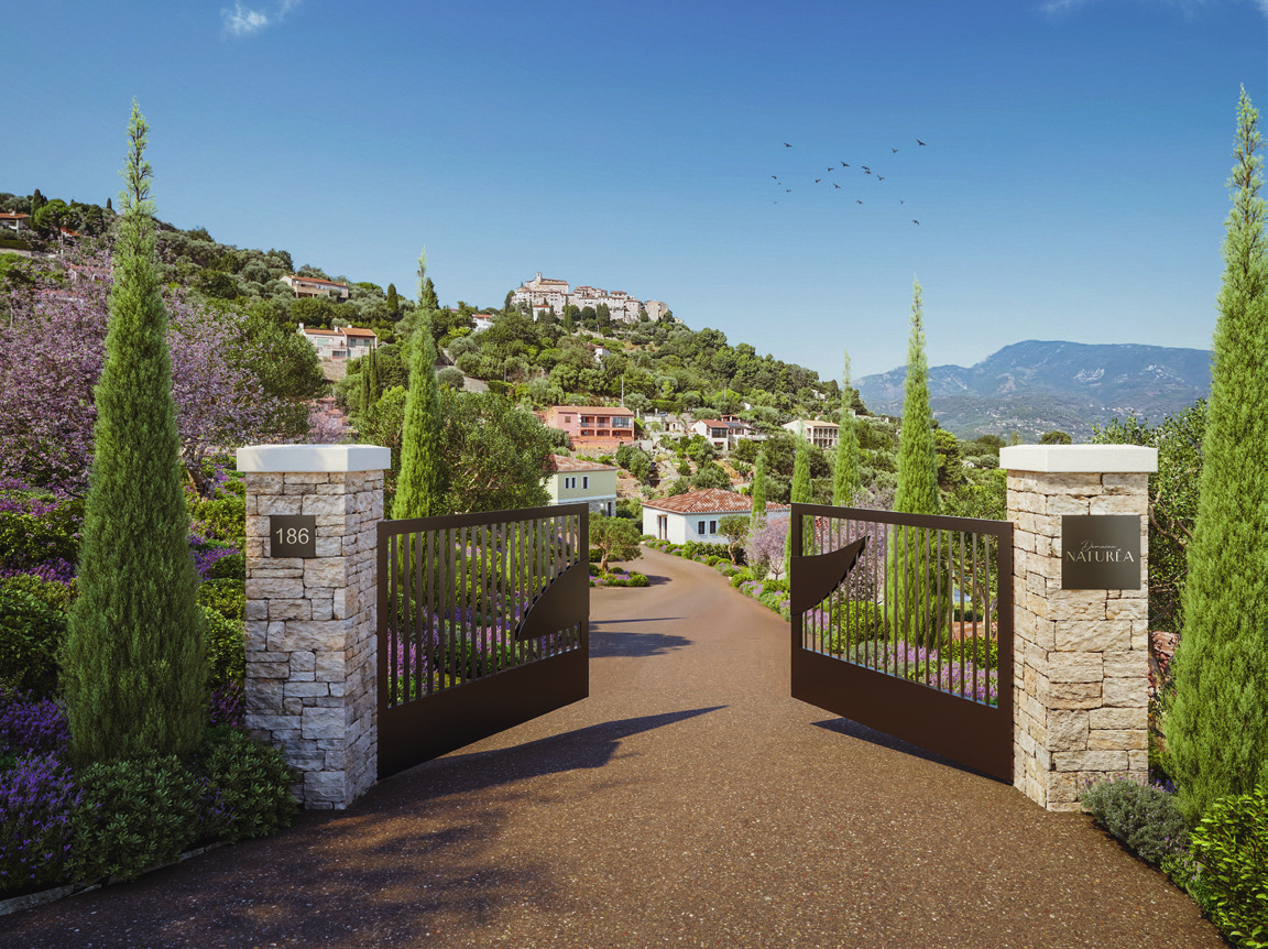 Pénétrez par un élégant portail ferronné et laissez-vous charmer par la vue sur le village perché de Carros. Le domaine, entièrement clos et sécurisé, propose une allée bordée de cyprès menant vers votre future villa.