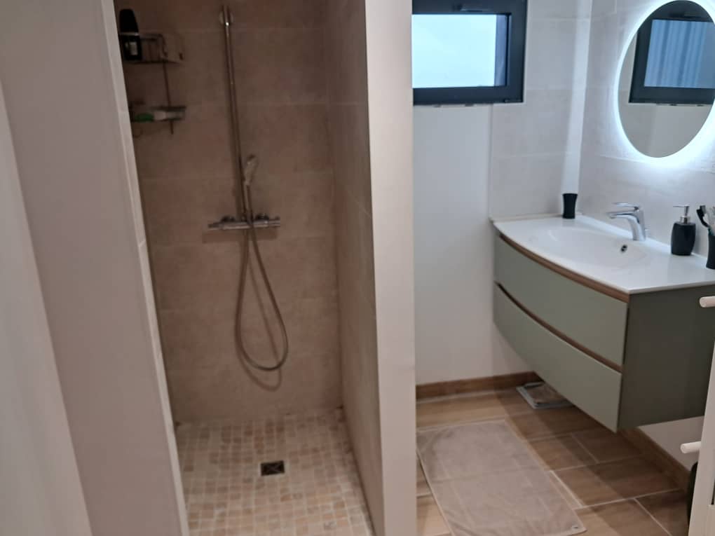 Equipped kitchen, utility room, WC, large bedroom, modern shower room, private terrace without overlooking.