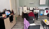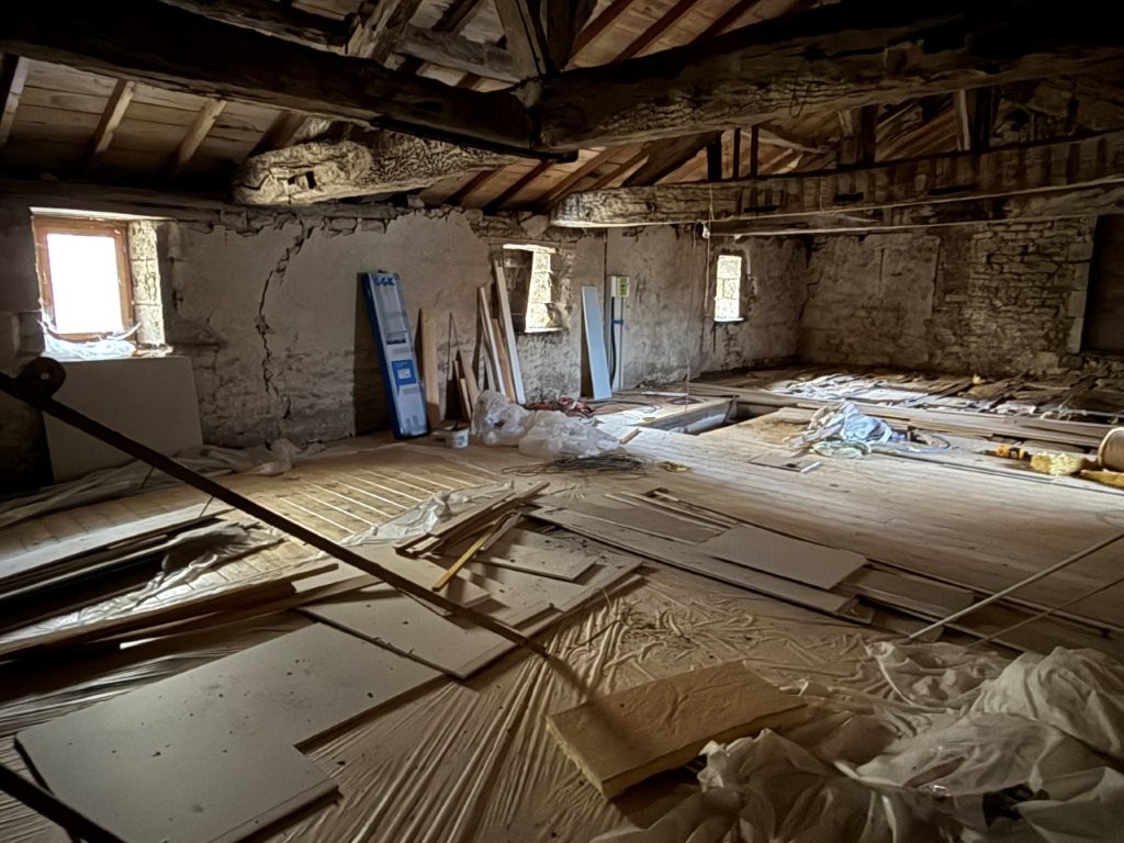 Living room – 28 m²: Laminate floor, fitted kitchen, exposed stone walls
