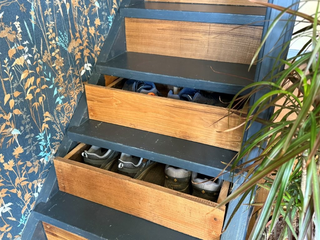-Living room (38m²): parquet flooring, woodburning stove, stone walls, cupboards under the stairs