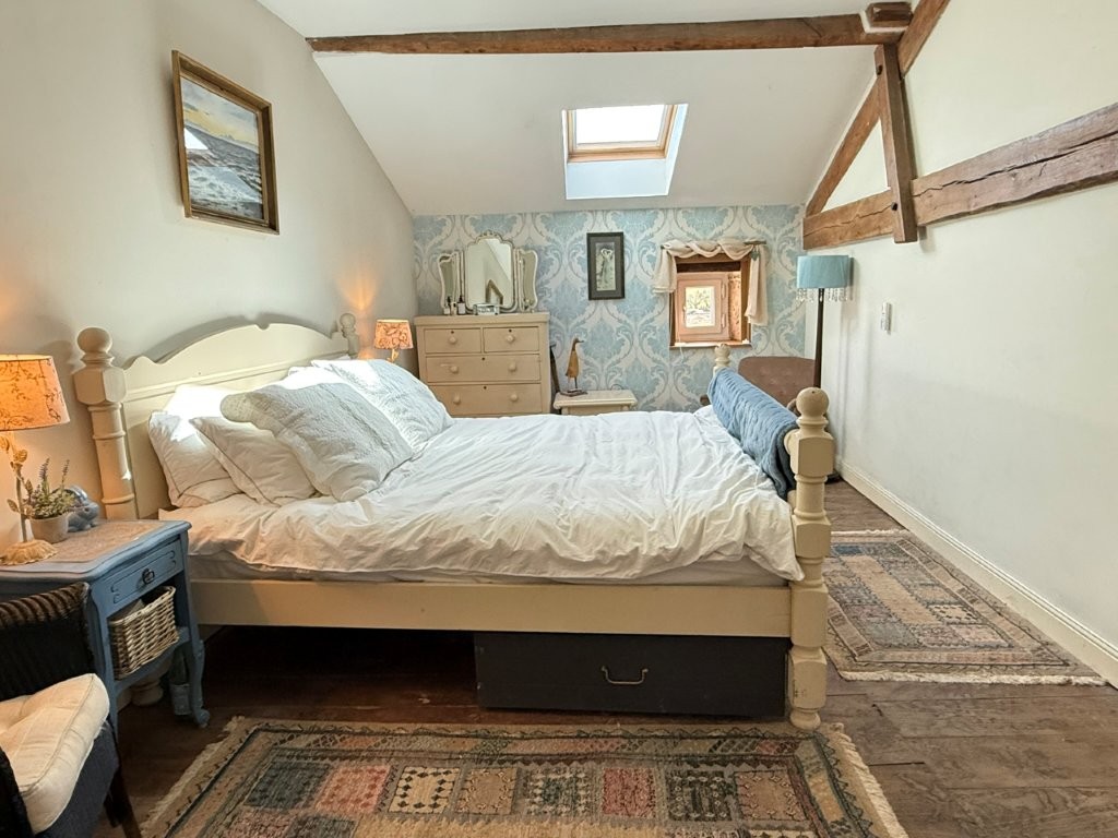 -Bedroom 2 (14m²): wooden floor, beams, Velux window