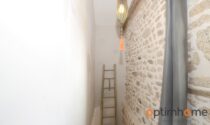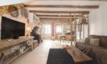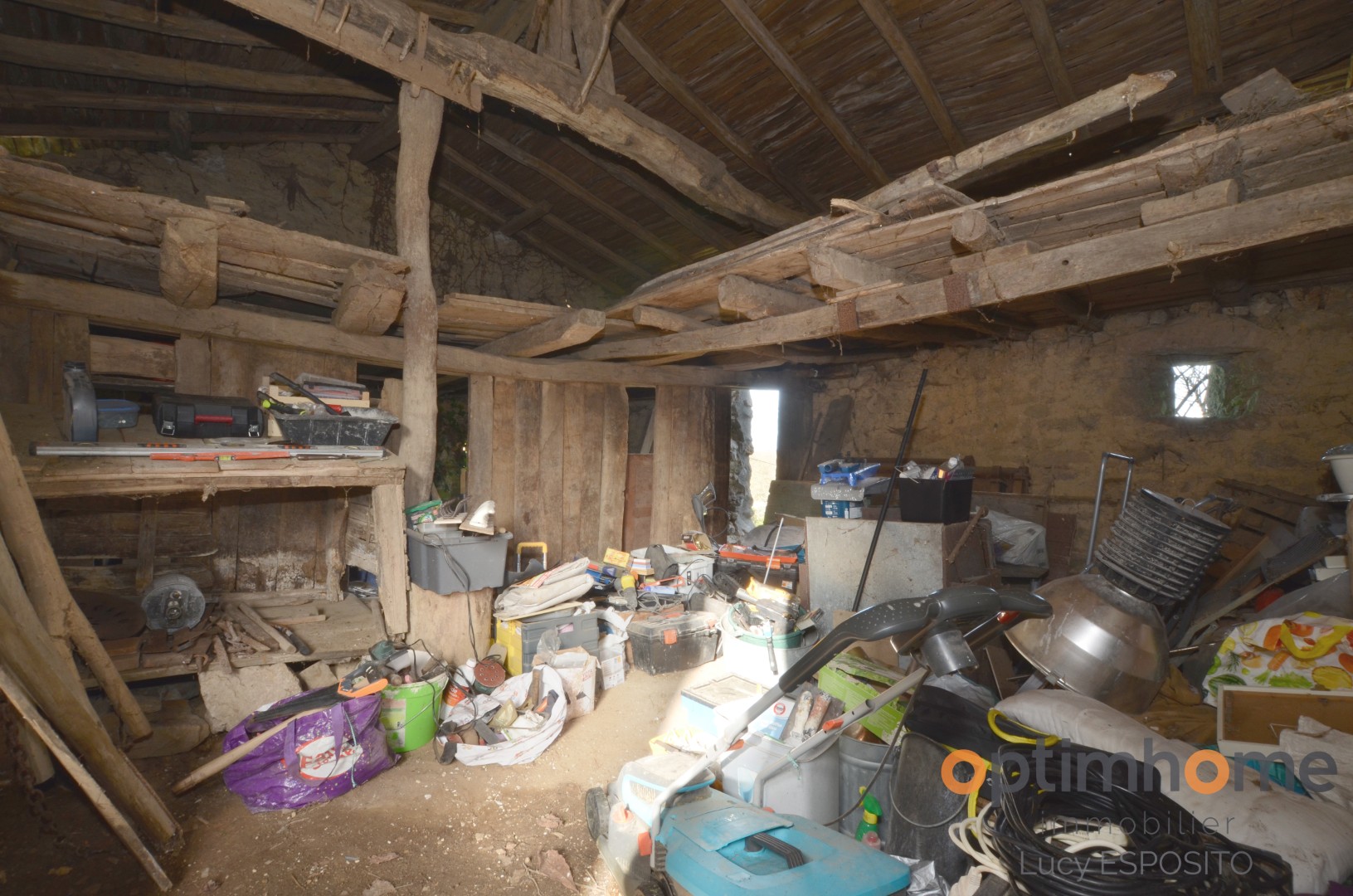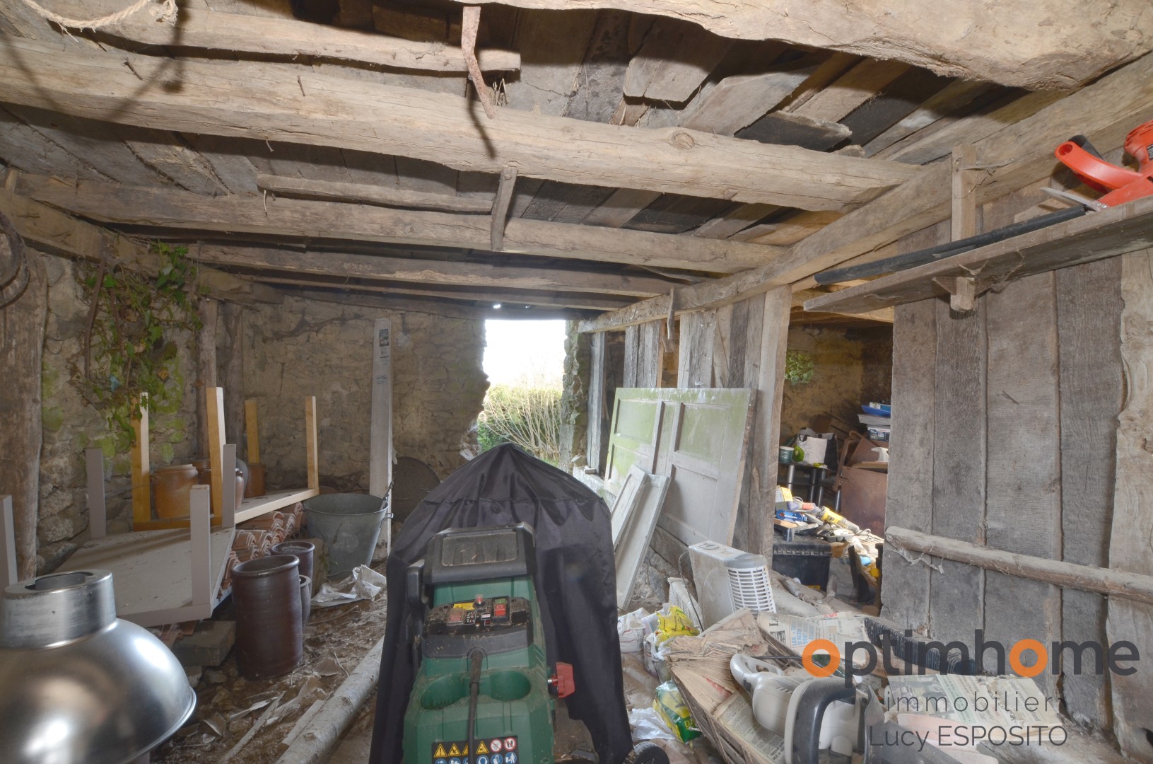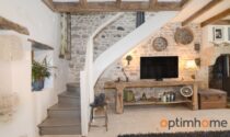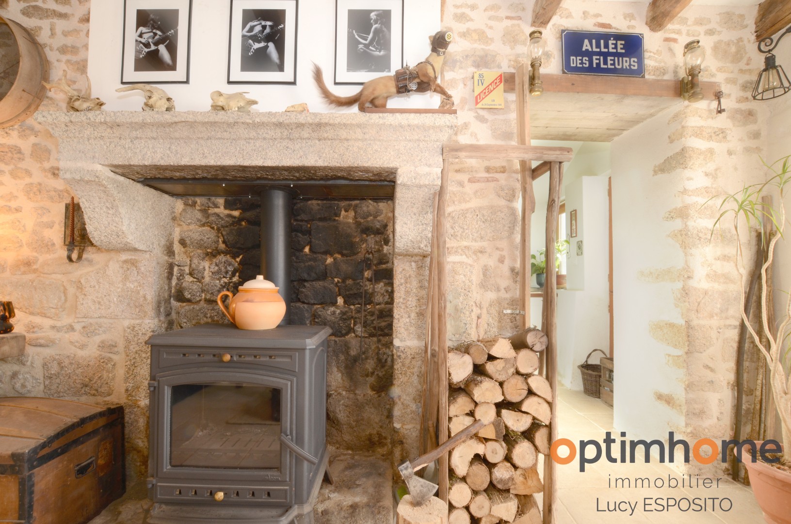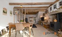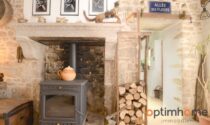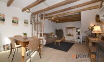 The house itself is full of character and charm. The entrance opens into a cosy living room with exposed wooden beams and a historic fireplace fitted with a wood-burning stove, creating a warm and inviting living space. The ground floor also includes a fully equipped kitchen and a very practical storage area.