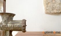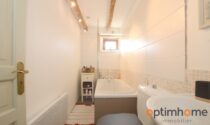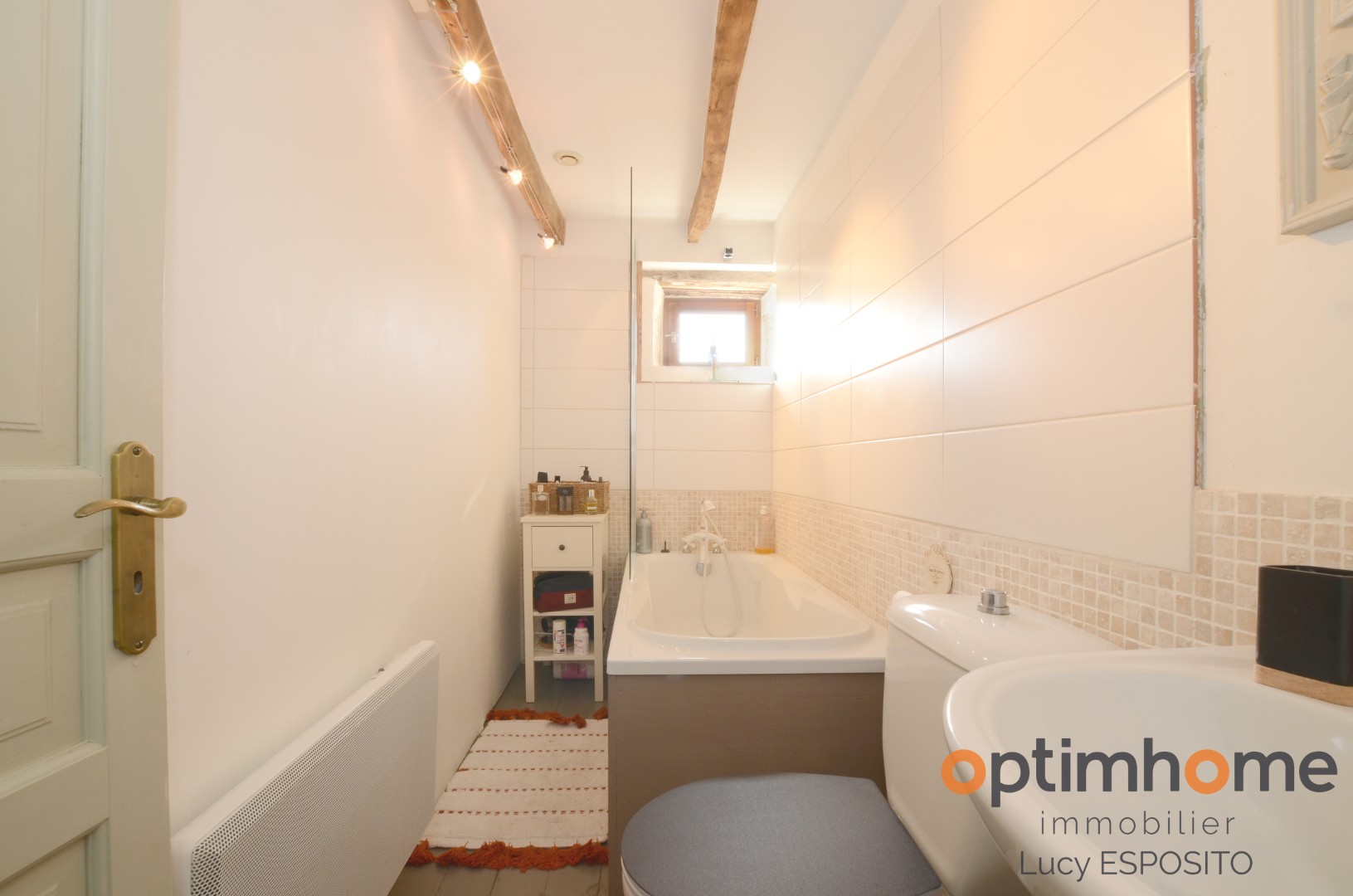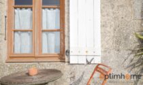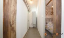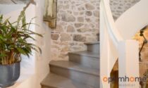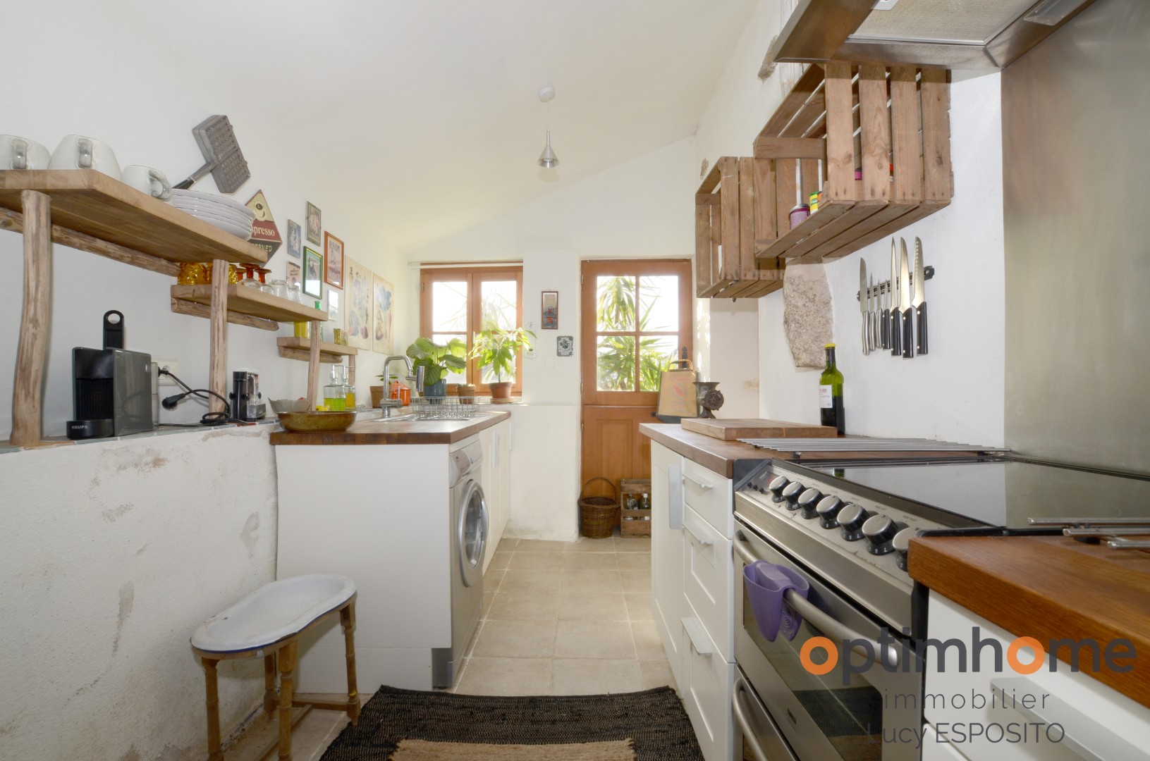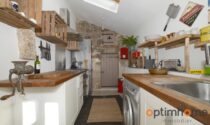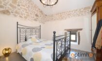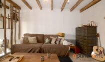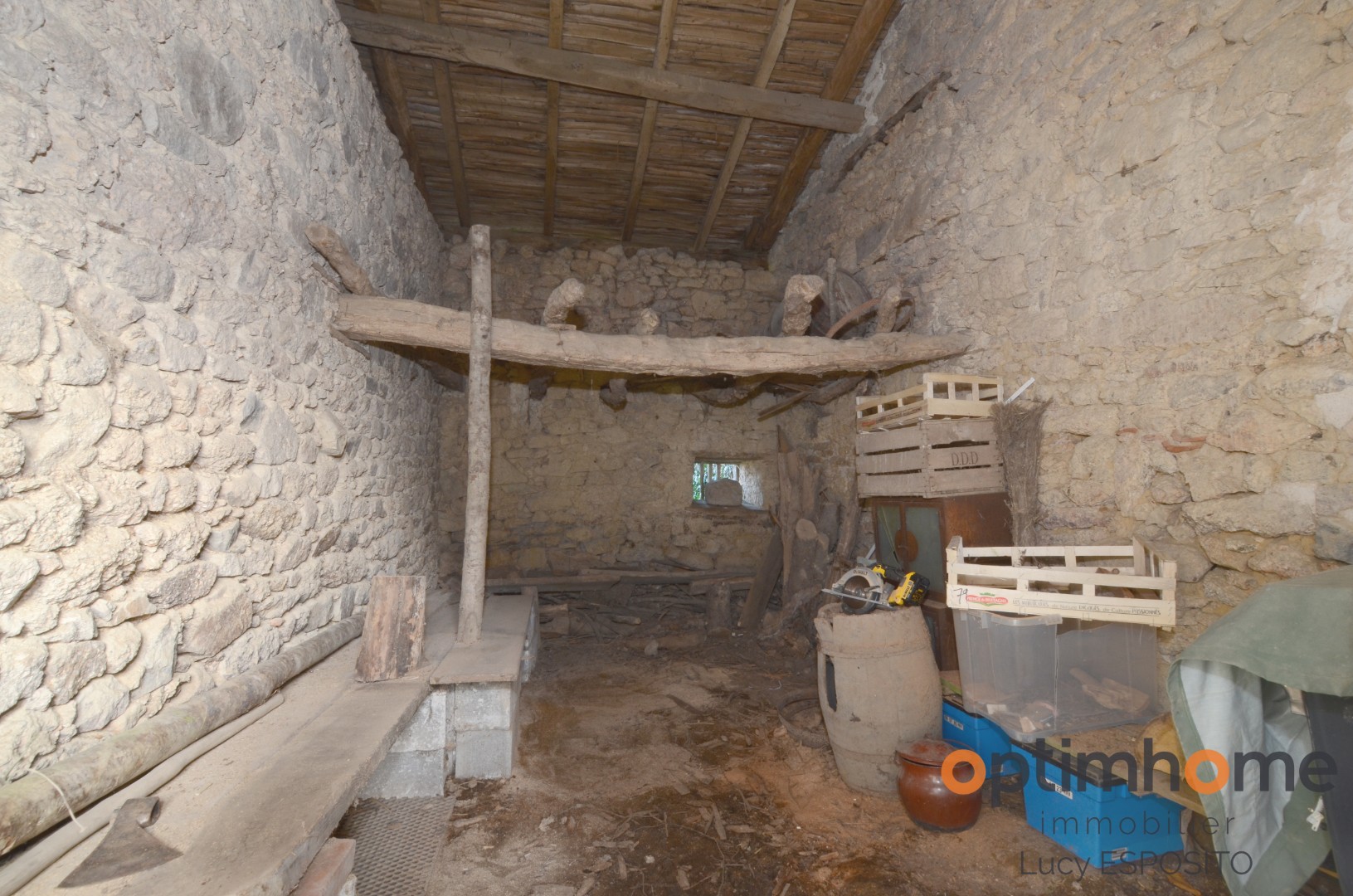 The house itself is full of character and charm. The entrance opens into a cosy living room with exposed wooden beams and a historic fireplace fitted with a wood-burning stove, creating a warm and inviting living space. The ground floor also includes a fully equipped kitchen and a very practical storage area.
