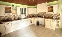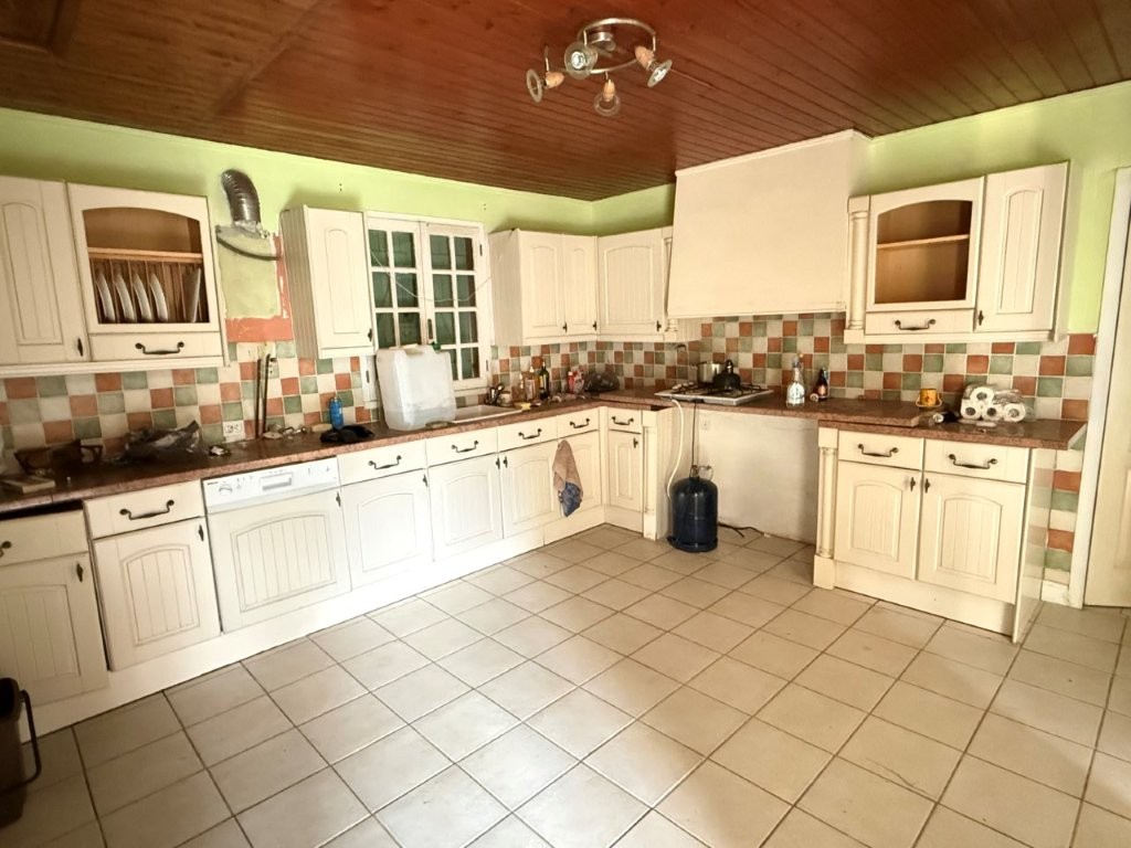 -Fitted kitchen (16m²): tiled floor, wood burner